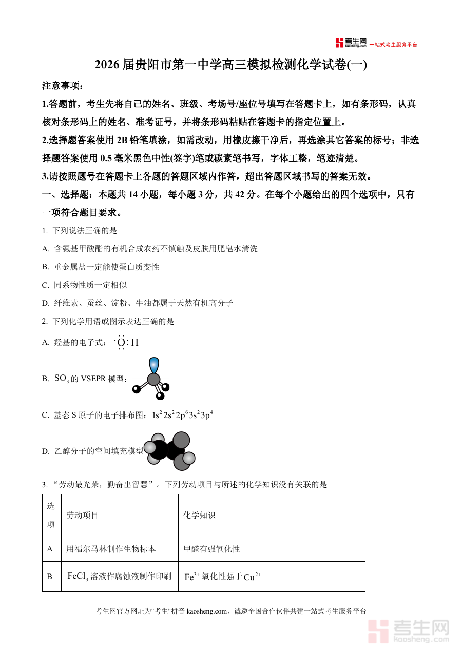 该资料主要适用于贵州省贵阳市南明区第一中学2026届高三学生,以及负责该年级化学教学与备考辅导工作教师群体,其作为阶段性模拟预测试题原卷版,能够有效帮助使用者了解当前阶段学习水平,明确后续学习重点与方向,对于提升高三化学学科备考效率具有积极意义,是该校高三化学学科备考过程中的重要辅助资源之一。