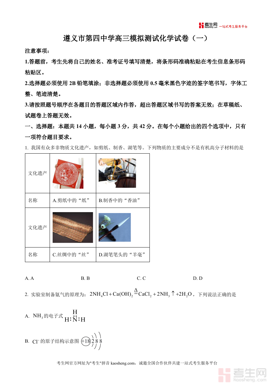 该资料适用人群为贵州省遵义市第四中学2026届高三年级学生及负责该届学生化学学科教学与备考指导工作的教师群体,其价值在于通过提供贴合本校实际情况的模拟预测试题原卷,为学生提供真实有效的备考训练载体,帮助学生适应考试节奏与形式,也为教师提供可靠评估工具,助力提升高三上学期化学学科备考工作质量与效率,确保备考方向与该校考试要求保持一致。