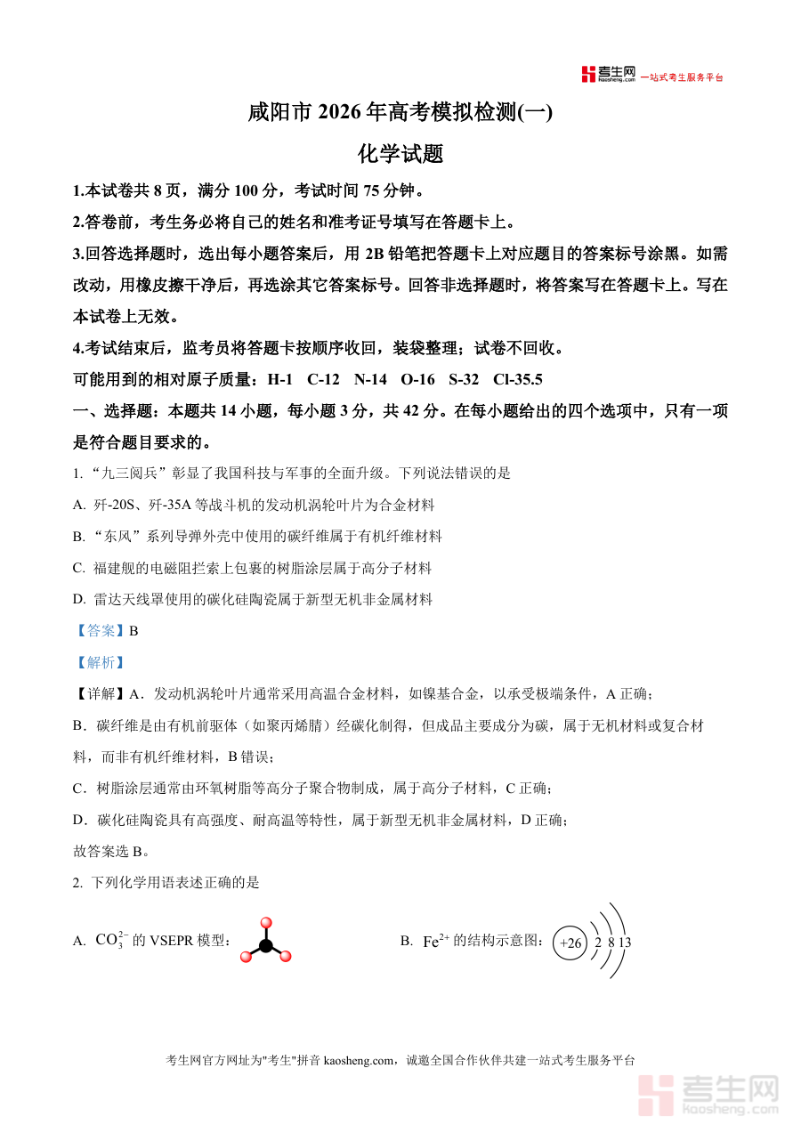 精品解析陕西省咸阳市2026届高三上学期一模考试化。学试题解析版docx是一份针对特定阶段考试的备考资。料核心围绕考试的时间地区与用途展开为考生提供阶段检。测与备考参考这份资料的核心用途在于帮助对应年级的学。生明确学习重点通过阶段考试诊断学情为后续复习规划提。供依据无论是开学摸底阶段检测还是考前。