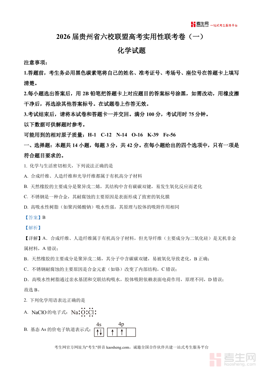 《精品解析:2026届贵州省六校联盟高三上学期高考实用性联考卷(一)化学试题(解析版).docx》是一份针对2026届贵州省六校联盟高三上学期高考实用性联考卷(一)的化学学科配套解析资料,明确对应特定年份、地区联盟及考试阶段的化学试题,为考生提供与该次联考直接相关的备考支持,内容严格贴合考试本身属性,不涉及额外知识点拓展或编造,专注于该次联考化学试题解析服务。