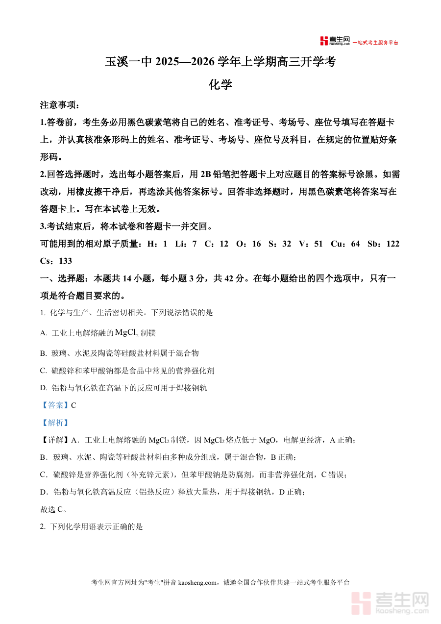 精品解析云南省玉溪第一中学20252026学年高三。上学期开学考试化学试题解析版docx是一份针对特定。阶段考试的备考资料核心围绕考试的时间地区与用途展开。为考生提供阶段检测与备考参考这份资料的核心用途在于。帮助对应年级的学生明确学习重点通过阶段考试诊断学情。为后续复习规划提供依据无论是开学摸底阶段。