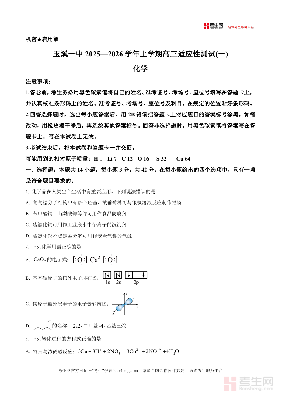 该资料适用于云南省玉溪第一中学2025-2026学年高三学生群体以及承担高三化学教学任务的教师群体。作为高三上学期首次适应性测试原卷,它既能支持学生进行自我学习效果检测,明确自身薄弱环节;又能为教师开展针对性辅导提供参考依据,对提升高三化学备考效率与质量具有积极支撑作用,是师生阶段性备考不可或缺的数据来源之一。