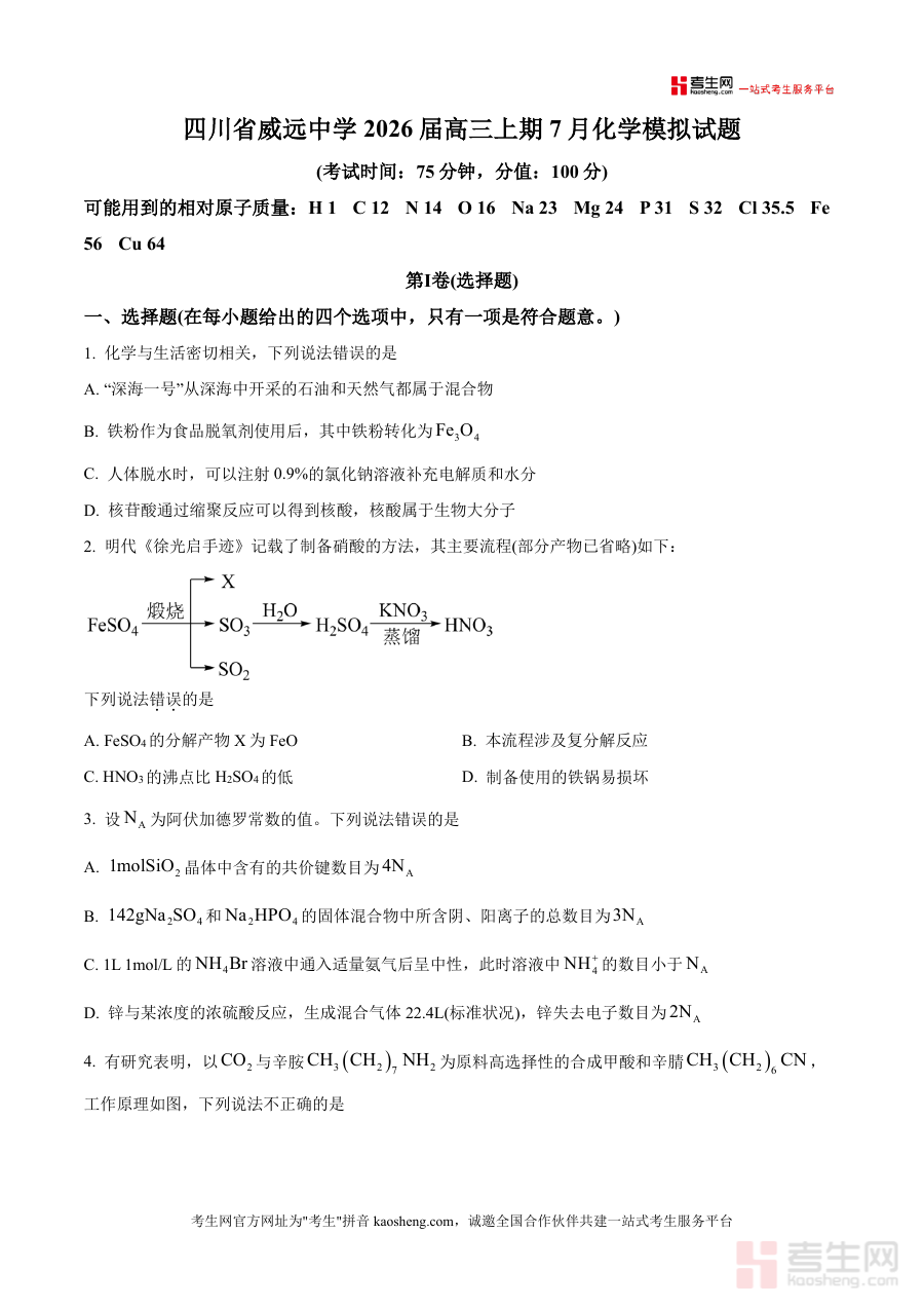 《精品解析:四川省威远中学校2026届高三上学期7月月考化学模拟试题(原卷版)》是一份针对四川省威远中学2026届高三学生在高三上学期7月开展化学月考所编制模拟试题资料;属于该校高三阶段化学学科阶段性检测相关备考资源;旨在为学生提供与月考匹配试题形式及内容框架参考依据;不涉及具体知识点或题型细节仅基于元信息呈现其定位与用途方向;符合教育类资料专业规范表述要求且严格遵循元信息提取原则。