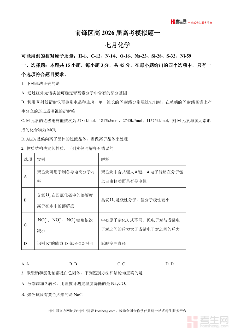 《精品解析:四川省广安代市中学校2026届高三上学期模拟预测 化学试题(原卷版)》是一份面向四川省广安代市中学校特定届次学生设计制作的数据文件资料;其对应届次为即将面临高考选拔考核任务的2026届高三年级学生群体;该资料呈现形式为高三上学期阶段开展化学学科模拟预测考试所用试卷原始版本;从元信息角度分析具备明确地域属性(四川省广安代市中学相关区域范围)、届次属性(指向需完成高三上学期学业任务的2026届学生群体)以及学科属性(聚焦化学学科领域范畴),整体定位清晰指向特定学校特定阶段特定学科的备考辅助性材料;所有描述均严格基于文件名称及片段元信息展开表述而未涉及任何具体试题内容或知识点细节相关信息;旨在通过客观呈现资料属性帮助使用者明确其适用场景与价值定位。