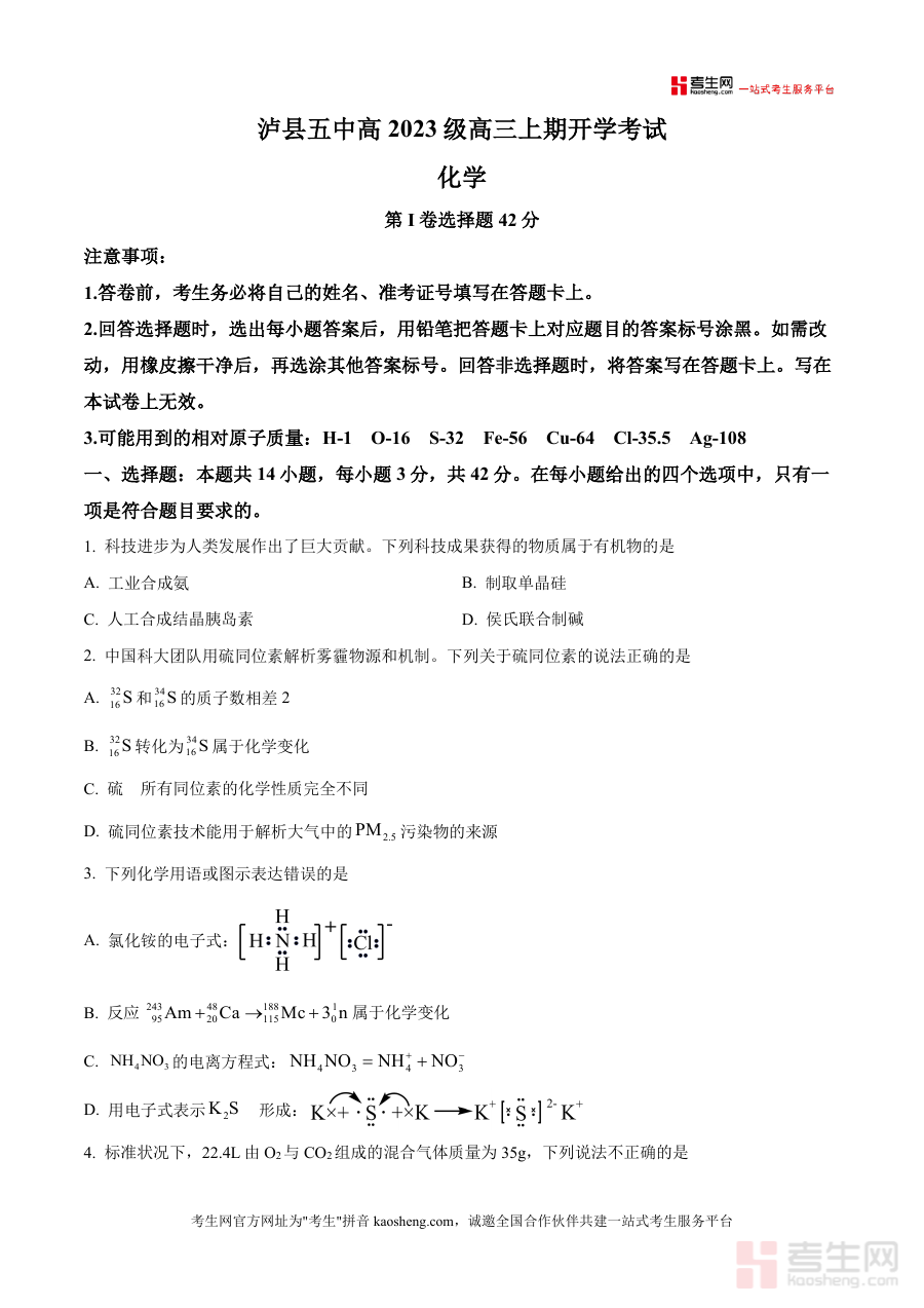 《精品解析:四川省泸州市泸县第五中学2025-2026学年高三上学期开学化学试题(原卷版).docx》是一份对应四川省泸州市泸县第五中学特定学年高三上学期开学阶段的化学学科考试试题原卷资料,明确指向2025-2026学年该校高三年级开学初期化学学科检测场景,能够呈现该阶段化学考试命题的基本框架与形式特征,为相关备考活动提供原始试卷参考依据,符合高三开学阶段化学学科考试的常规设置需求