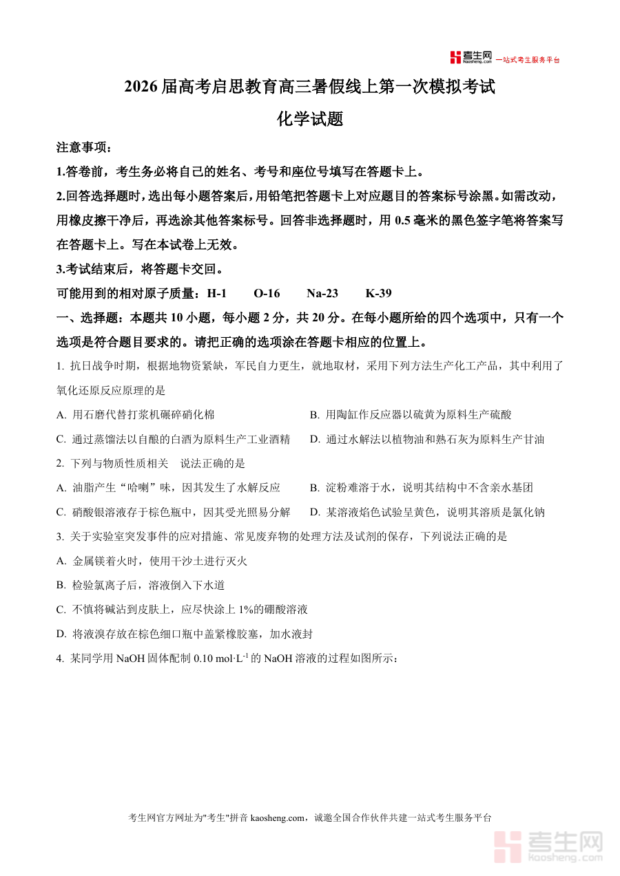 《精品解析:山东省启思大联考2025-2026学年高三上学期开学联考化学试题(原卷版)》是一份针对山东省启思大联考体系下2025-2026学年高三上学期开学阶段设置的确化学学科考试资料。该资料对应高三年级开学初期的联考检测环节,属于高考备考周期内阶段性原卷类资源,其设计与山东省启思大联考开学检测安排相匹配,符合高三开学阶段化学学科基础检测的需求定位。