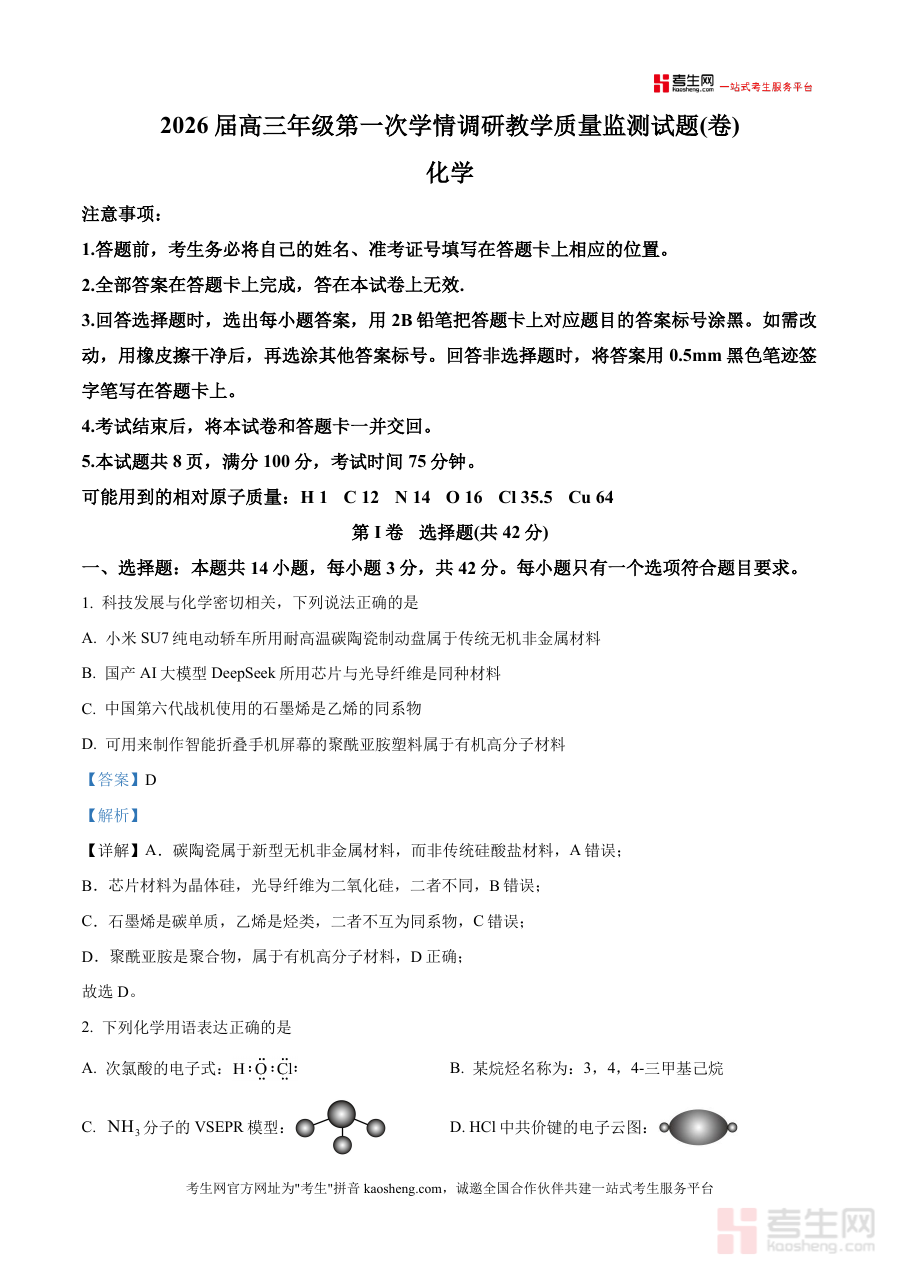 《精品解析:山西省大同市2026届高三上学期第一次学情调研教学质量监测化学试题(解析版).docx》是一份针对山西省大同市2026届高三学生上学期第一次学情调研教学质量监测化学考试编制而成专业解析资料。该资料基于当地高三年级第一次学情调研教学质量监测试题卷进行深度解析,旨在为学生提供全面的试题解答服务,帮助他们更好地理解考试内容和要求,掌握答题思路和方法,提升学习效果和应试能力。