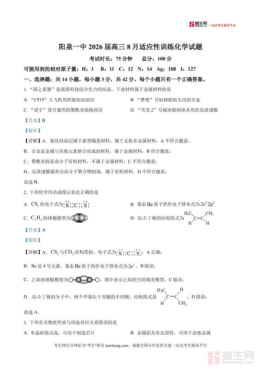 该资料适用于山西省阳泉市第一中学校2026届高三学生及从事相关化学学科备考指导工作的教师等人员,作为高三开学阶段化学学科学习效果评估与备考规划辅助工具使用,有助于学生适应高三考试节奏,明确后续学习重点方向,为整个高三学年的化学备考奠定基础。