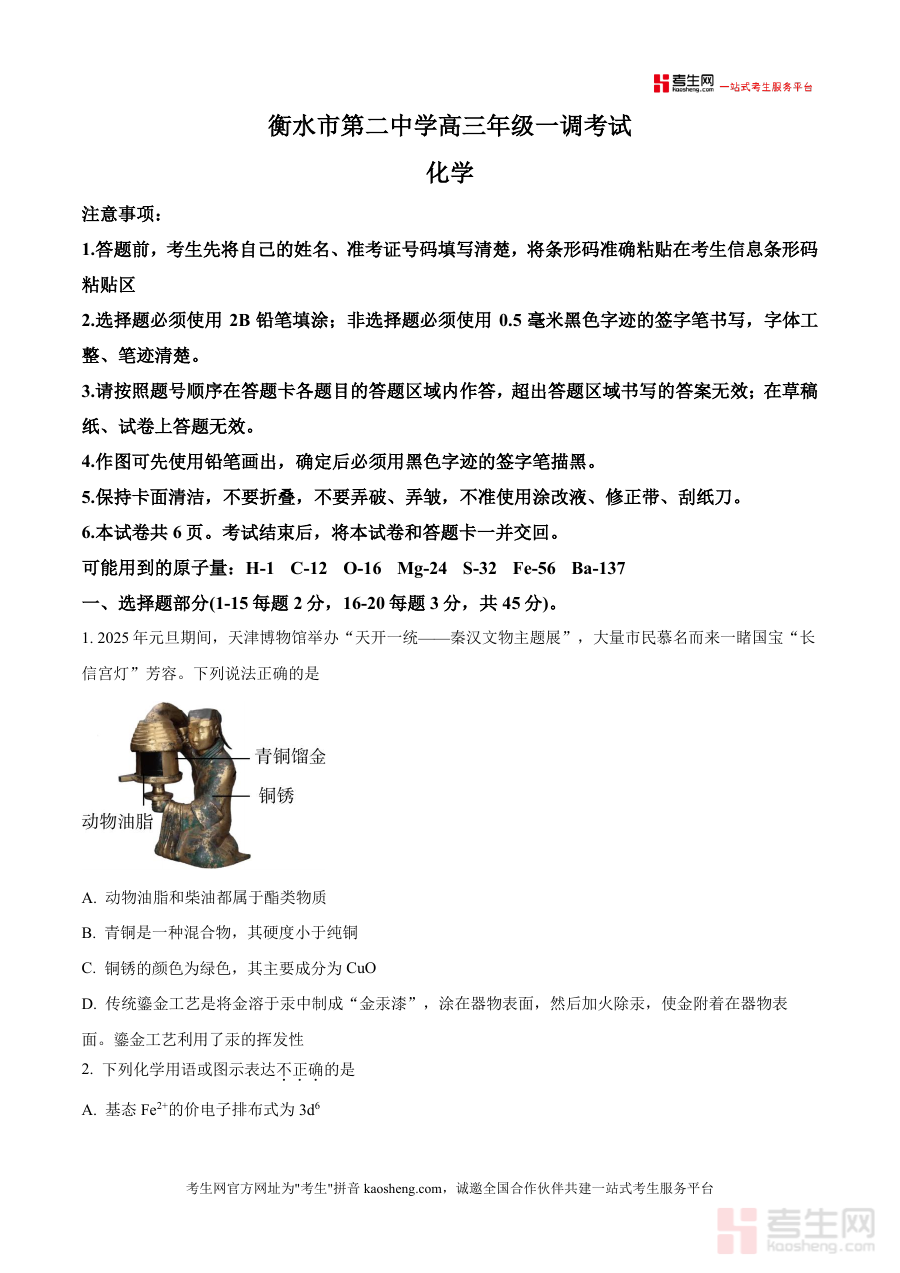 《精品解析:河北省衡水市第二中学年高三上学期一调考试化学试题(原卷版)》是一份针对河北省衡水市第二中学年至学年高三年级上学期第一次调研考试设计化学学科备考资料;该资料严格匹配本次调研考试化学科目原卷呈现形式及相关规范要求;作为直接对应本次特定阶段检测的数据载体,其内容与实际考试场景高度契合,为相关备考主体提供精准适配考试要求参考素材。
