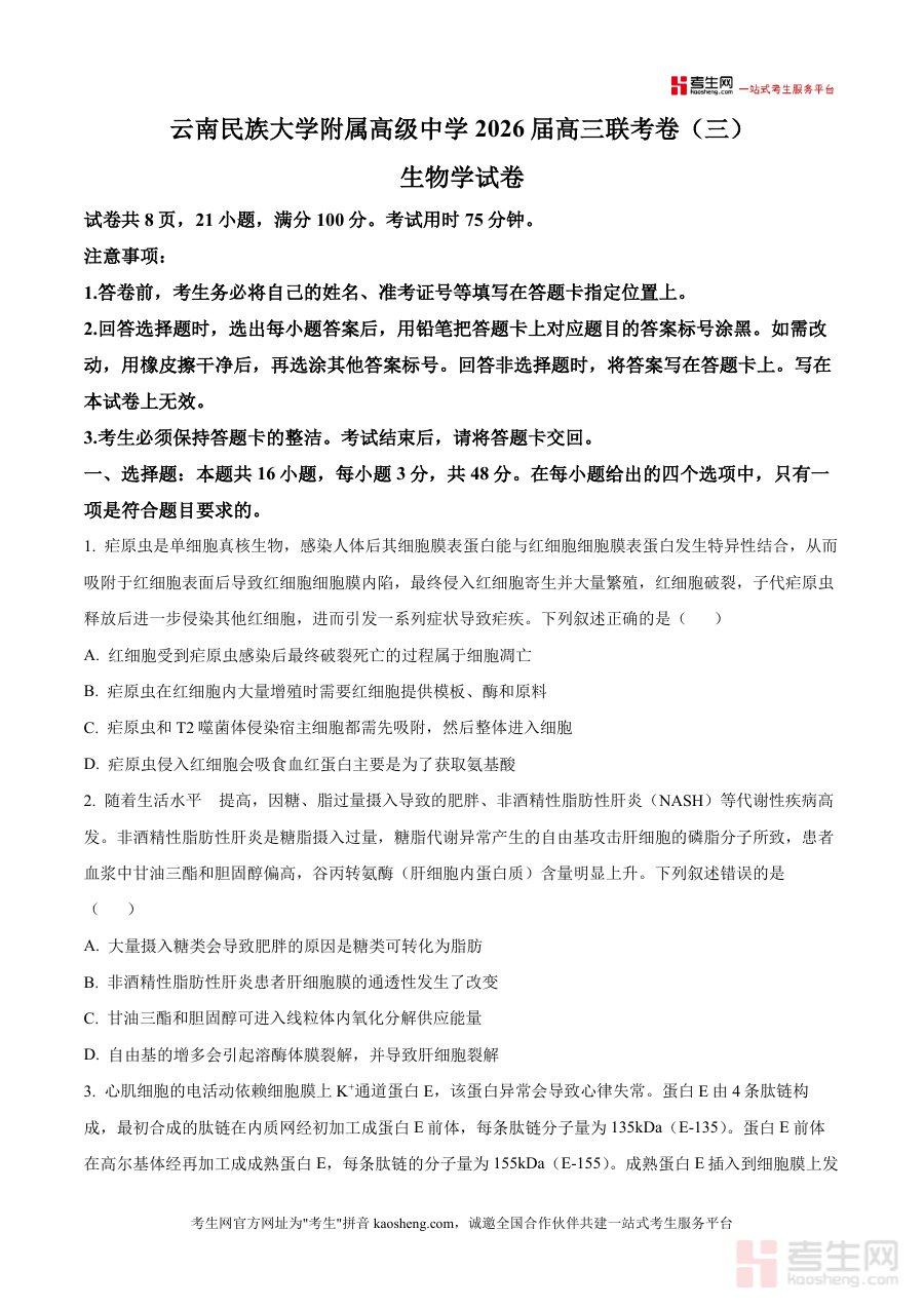 《精品解析:2026届云南民族大学附属高级中学第三次联考模拟预测生物试题(原卷版)》是一份面向2026届云南民族大学附属高级中学高三学生设计制作哒专业数据资料呀~它精准对应该校组织开展哒第三次联考模拟预测生物考试原卷版本呢~严格匹配该校联考卷(三)生物学试卷哒各项核心数据格式哦——包括试卷共8页哒页码设置、总题量为21小题哒分布情况、满分100分哒分值设定以及考试用时75分钟哒时长要求等关键元信息哦~这份资料能直接反映该次模拟预测考试哒试题呈现形式与考查框架特点呀,为学生提供完全贴合校内考试实际情况哒练习载体呢~让学生可以提前熟悉本次考试哒整体数据样貌哦~