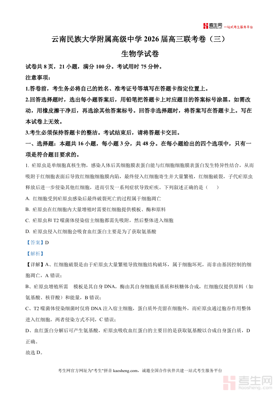 《精品解析:2026届云南民族大学附属高级中学第三次联考模拟预测生物试题(解析版).docx》是一份针对2026届云南民族大学附属高级中学高三年级第三次联考设计的生物学科模拟预测试题及配套解析资料。该资料对应学校内部高三阶段的关键联考节点,属于生物学科备考过程中的阶段性模拟检测类资料,贴合学校联考的命题方向与考试要求,为师生提供标准化的备考支持材料,助力高三生物学科阶段复习与检测工作有序开展。
