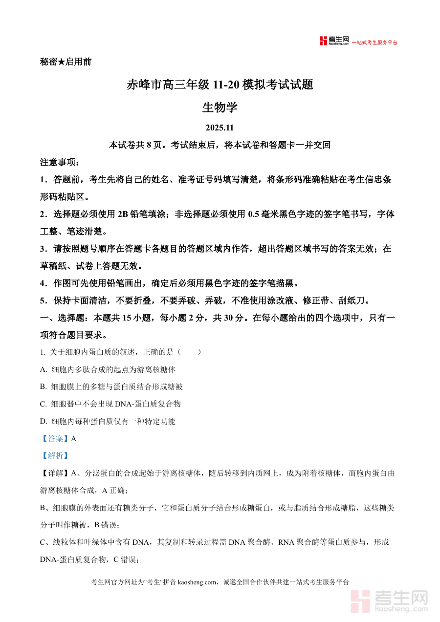 精品解析2026届内蒙古赤峰市高三一模生物试题解析。版docx是一份针对特定阶段考试的备考资料核心围绕。考试的时间地区与用途展开为考生提供阶段检测与备考参。考这份资料的核心用途在于帮助对应年级的学生明确学习。重点通过阶段考试诊断学情为后续复习规划提供依据无论。是开学摸底阶段检测还是考前模拟都。