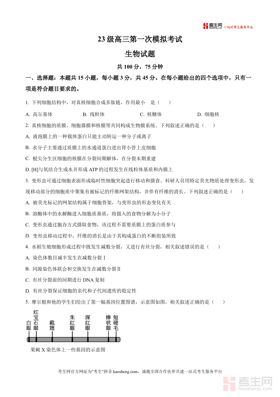 《精品解析:2026届四川省仁寿第一中学校南校区高三上学期一模生物试题(原卷版).docx》是一份针对2026届四川省仁寿第一中学校南校区高三学生的生物学科阶段性检测资料,对应高三上学期第一次模拟考试。该资料呈现了原卷形式的生物试题,包含选择题和非选择题两大部分,能够帮助学生了解本次模拟考试生物学科的考查形式与结构,为备考提供直接参考依据,不涉及具体知识点的解析内容,仅基于文件名和内容片段中的元信息呈现资料属性。