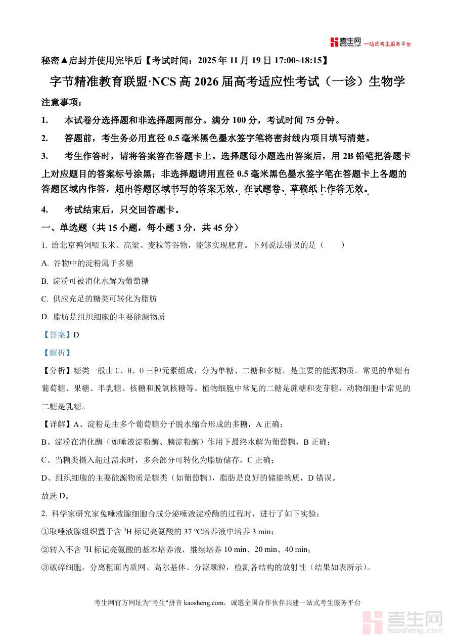 这份资料主要用于2026届四川省字节精准教育联盟NCS高三学生在完成此次11月高考适应性考试(一诊)后,对生物试题进行系统解析参考,帮助梳理考试中的答题情况及对应的解题思路,辅助考生及辅导者对阶段学习效果进行客观评估,为后续生物学科备考规划提供具体参考,支持对考试相关内容进行针对性回顾与整理工作,是衔接阶段学习与后续备考之间重要桥梁性资料。