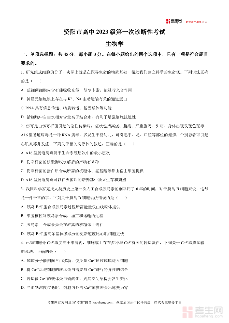 此资料适用人群为2026届四川省资阳市高三年级学生,以及从事高三生物学科教学或备考辅导工作相关人员,作为高三上学期第一次诊断性考试前重要备考资源,其价值在于帮助使用者提前适应考试形式,明确阶段学习检测目标,为后续提升备考效率提供坚实基础支持。