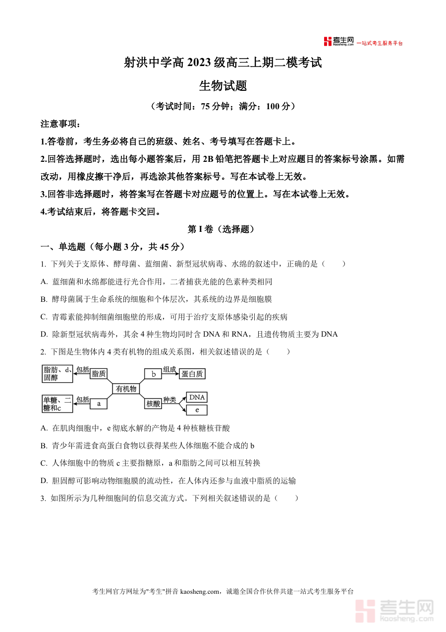 它适用于四川省射洪中学校高2023级(即2026届)高三学生群体及负责该年级生物学科教学与备考工作教师团队,作为高三上期二模考试核心资料之一,其原卷形式能构建真实考试场景下的生物检测环境,具有重要阶段备考参考价值,助力师生高效完成二模考试相关准备工作。