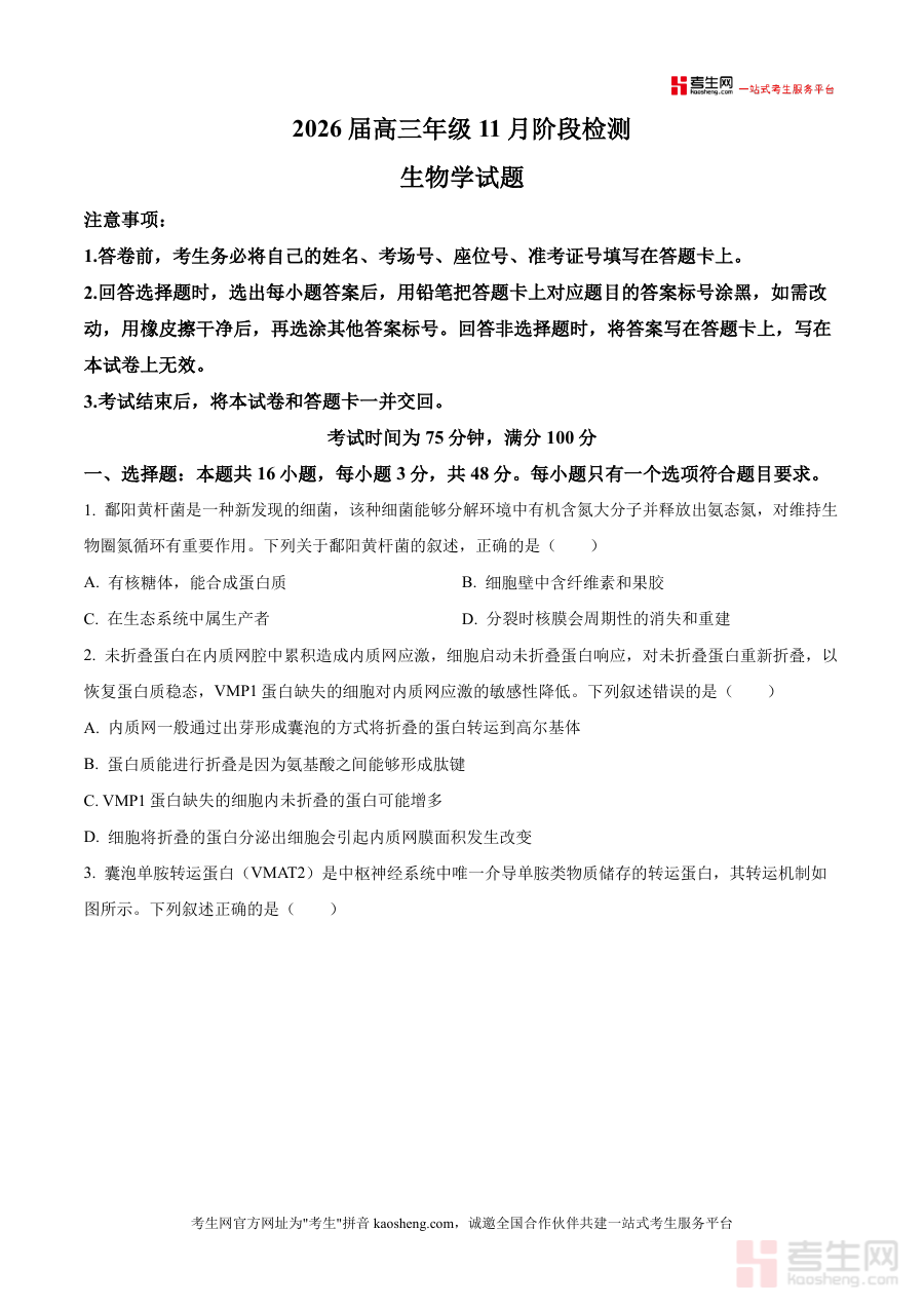 这份资料主要用于两个核心场景:对于学生而言,可作为11月阶段检测前的模拟练习材料,通过完成试题熟悉考试流程、时间分配及题型结构特点,从而准确评估自身在生物学科知识掌握上存在薄弱环节;对于教师而言,则可将其作为阶段性教学效果评估的工具,通过分析学生答题情况把握班级整体学习进度与共性问题,进而调整后续教学策略与复习计划方向提升针对性,助力学生更高效地应对后续生物学科考试任务。