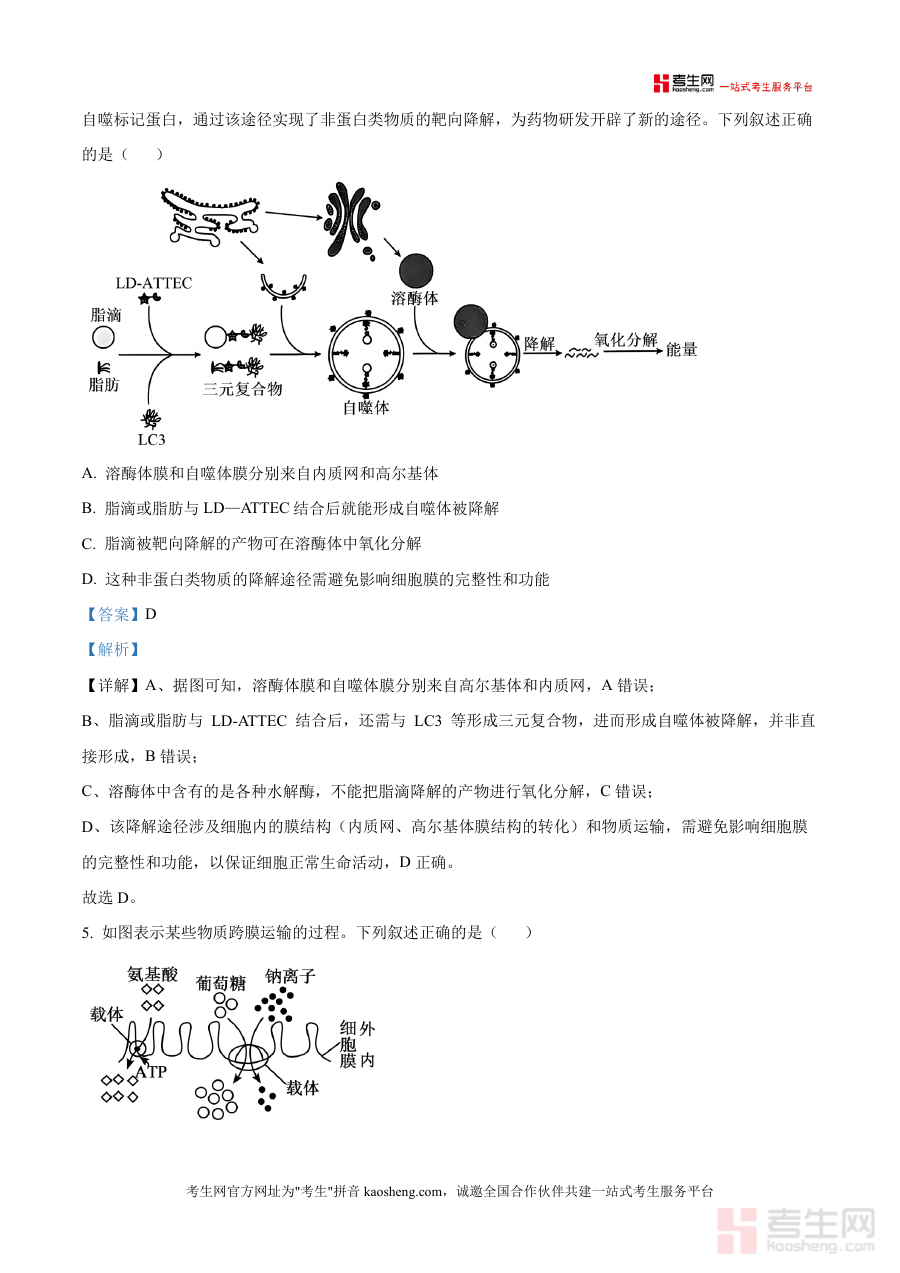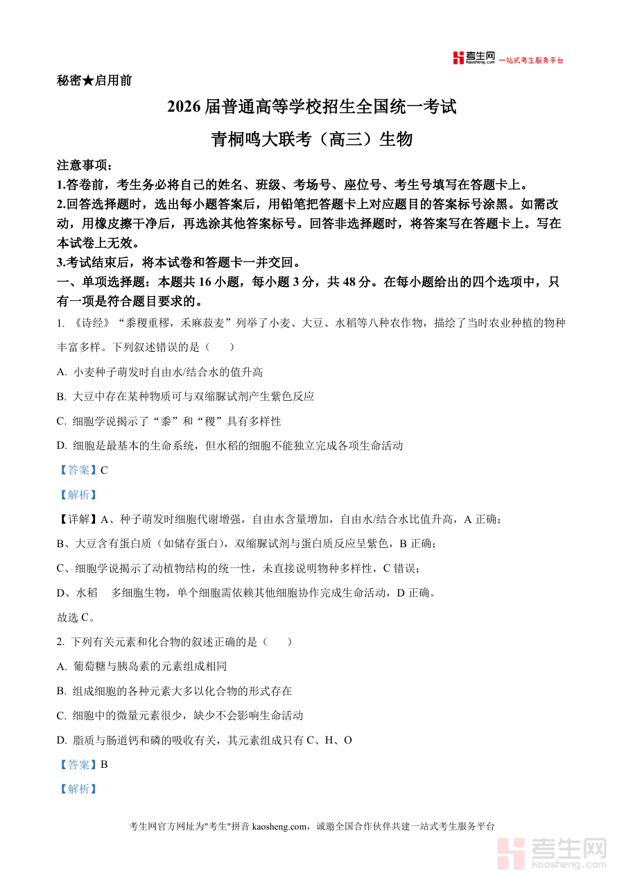 这份资料主要用于高三学生进行生物学科知识掌握情况自我检测或教师开展教学评估活动,通过对应考试形式练习,使用者能直观了解自身对生物学科相关内容掌握程度,并借助解析部分明确答题思路方向;同时,资料包含考试注意事项部分能帮助使用者提前熟悉答卷前信息填写、不同题型作答方式等规范要求,进一步提升备考效率与应试能力