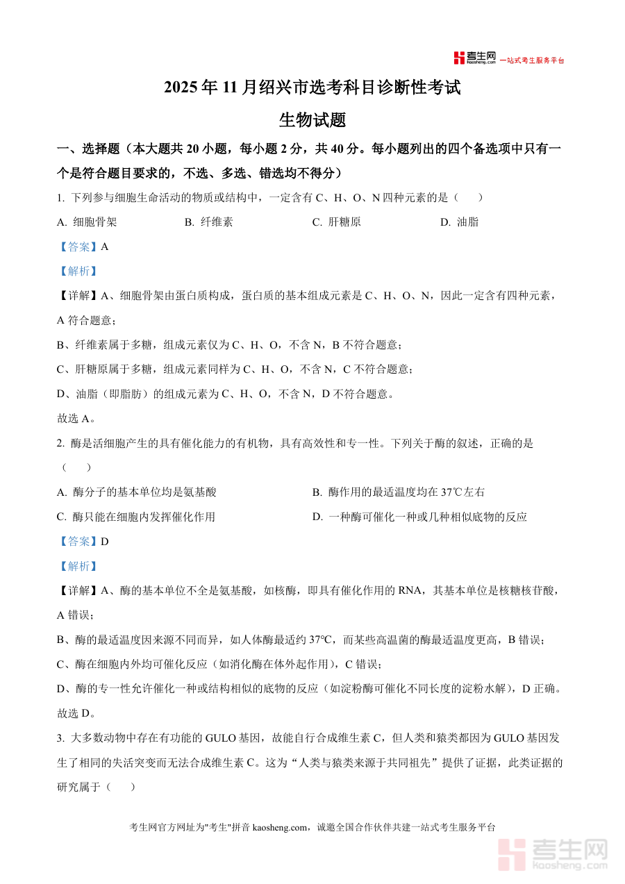《精品解析:浙江省绍兴市2026届高三一模考试生物试卷(解析版)》是一份针对浙江省绍兴市2026届高三学生的生物学科一模考试解析资料,基于2025年11月绍兴市选考科目诊断性考试生物试题编制,属于高三阶段重要的选考科目诊断性考试配套解析材料,旨在为使用者提供该次考试试题的详细解析内容,对应高三学生进入高考备考关键阶段进行模拟检测后的学习支持,覆盖选考生物科目的诊断性考试相关需求。