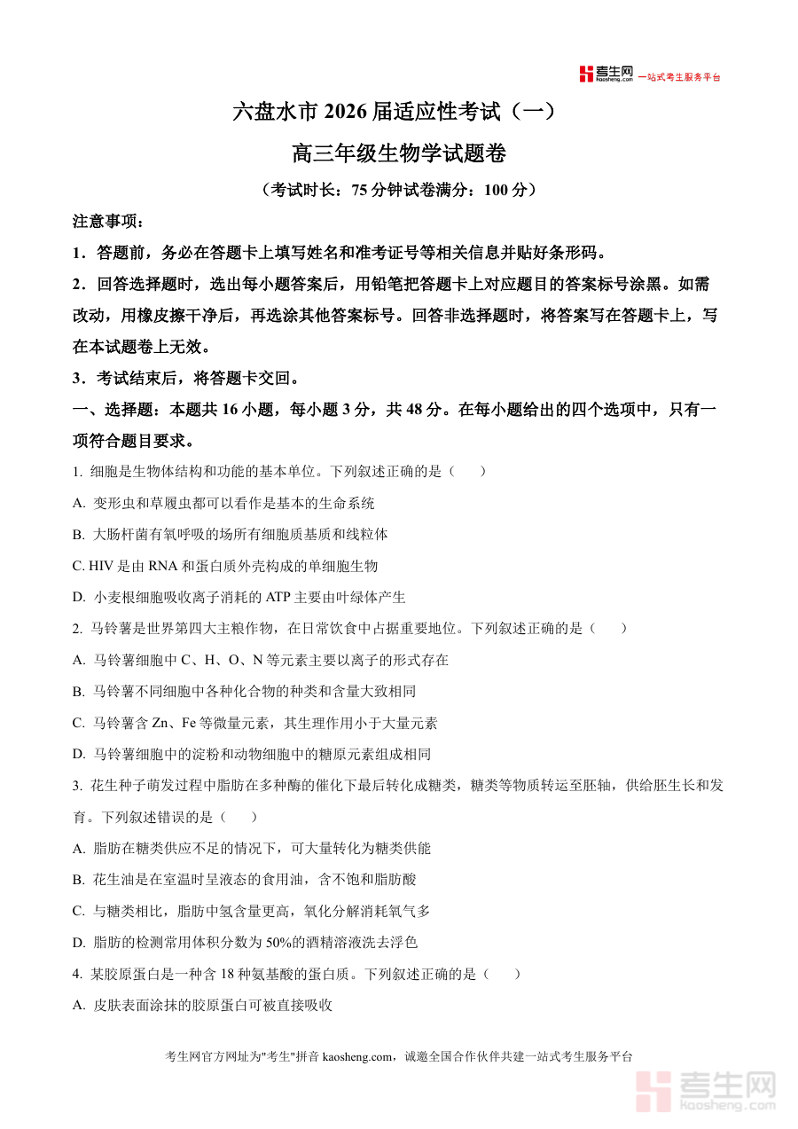 《精品解析:贵州省六盘水市2026届高三上学期适应性考试生物试题(一)(原卷版).docx》是一份针对贵州省六盘水市2026届高三学生设计制作的生物学科备考资料,对应高三上学期阶段第一次适应性考试环节,贴合本地教育考试要求与命题方向,呈现该适应性考试生物科目的原卷内容,旨在帮助学生熟悉适应性考试生物科目的考试形式、时长设置及答题规范,为后续系统备考提供基础参考依据,助力学生提前适应本地高三生物适应性测试整体流程与要求。