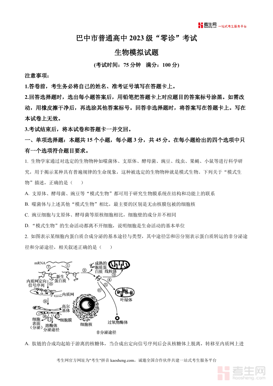该资料适用人群为四川省巴中市2026届普通高中在读学生及从事该届学生生物学科备考指导工作教师或辅导人员;作为贴合本地“零诊”考试类型模拟预测试题原卷;其能为使用者提供符合当地考试实际情况阶段检测支持;助力备考过程中对考试形式认知及答题准备方面的提升;辅助使用者更高效地开展备考工作。