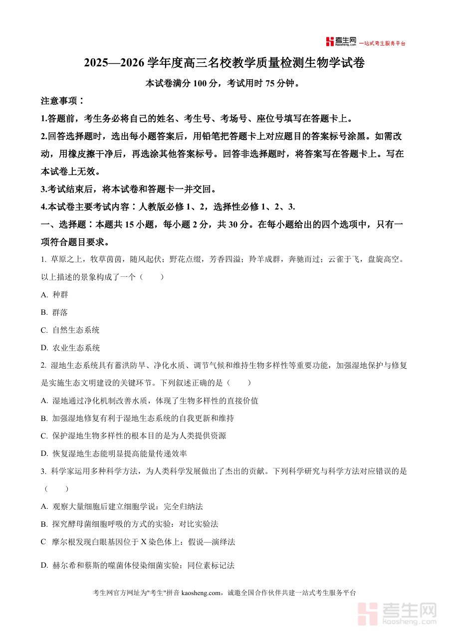 《精品解析:内蒙古名校2025-2026学年高三上学期8月开学教学质量检测生物试卷(原卷版)》是一份针对内蒙古地区名校高三学生设计制作的松学学科阶段检测资料;对应2025-2026学年高三上学期8月开学初期开展教学质量检测使用;试卷设定满分100分、考试用时75分钟;考查范围涵盖人教版必修1、必修2及选择性必修1至3模块内容;作为原卷版呈现完整试卷结构及题目设置框架;包含选择题与非选择题等题型设置;严格遵循考试注意事项规范;符合高三开学阶段检测需求;能够真实反映学生假期学习效果与当前知识掌握程度;