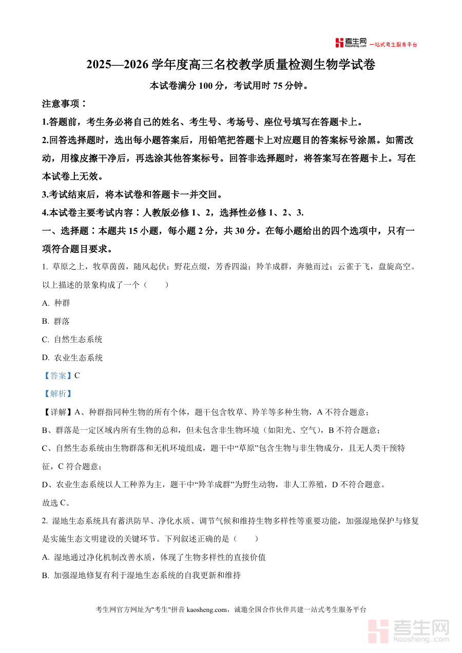 《精品解析:内蒙古名校2025-2026学年高三上学期8月开学教学质量检测生物试卷(解析版).docx》是一份针对内蒙古地区名校2025-2026学年高三年级上学期8月开学阶段教学质量检测生物科目的备考资料。该资料基于此次开学教学质量检测设计,包含完整的试卷内容及对应解析,旨在为相关人员提供全面的参考依据,帮助了解该次检测的整体情况。作为解析版资料,它能够清晰呈现试卷结构与题目解答思路,满足使用者对该次检测的详细了解需求,具备明确针对特定考试场景和时间节点使用价值。