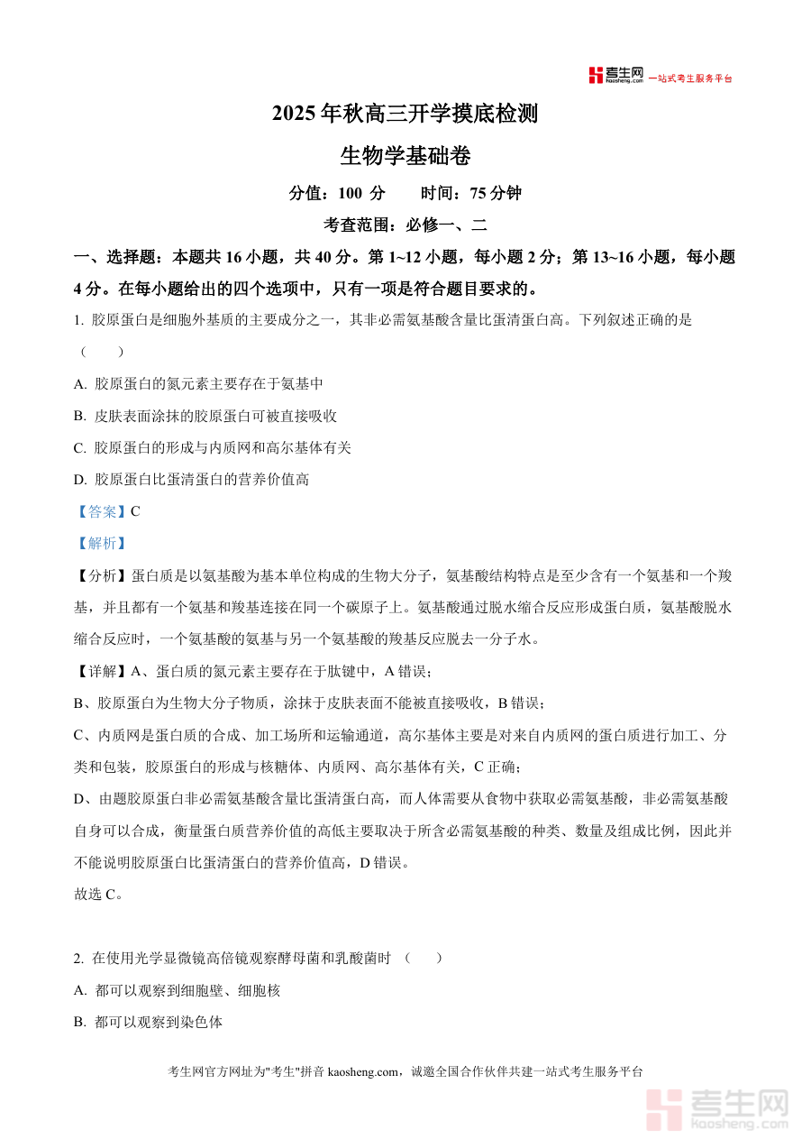 其适用人群为安徽省阳市第二中学2025级高三学生及该校生物学科教师,对于学生而言,可借助该解析资料了解开学检测中的相关反馈要点;对于教师而言,则能通过该资料更高效地完成检测结果分析,助力后续教学规划与学情精准把握,充分发挥阶段检测在高三生物备考初期对学习状态诊断及教学策略优化方面的价值作用,为新学期生物学科教学与备考奠定基础。