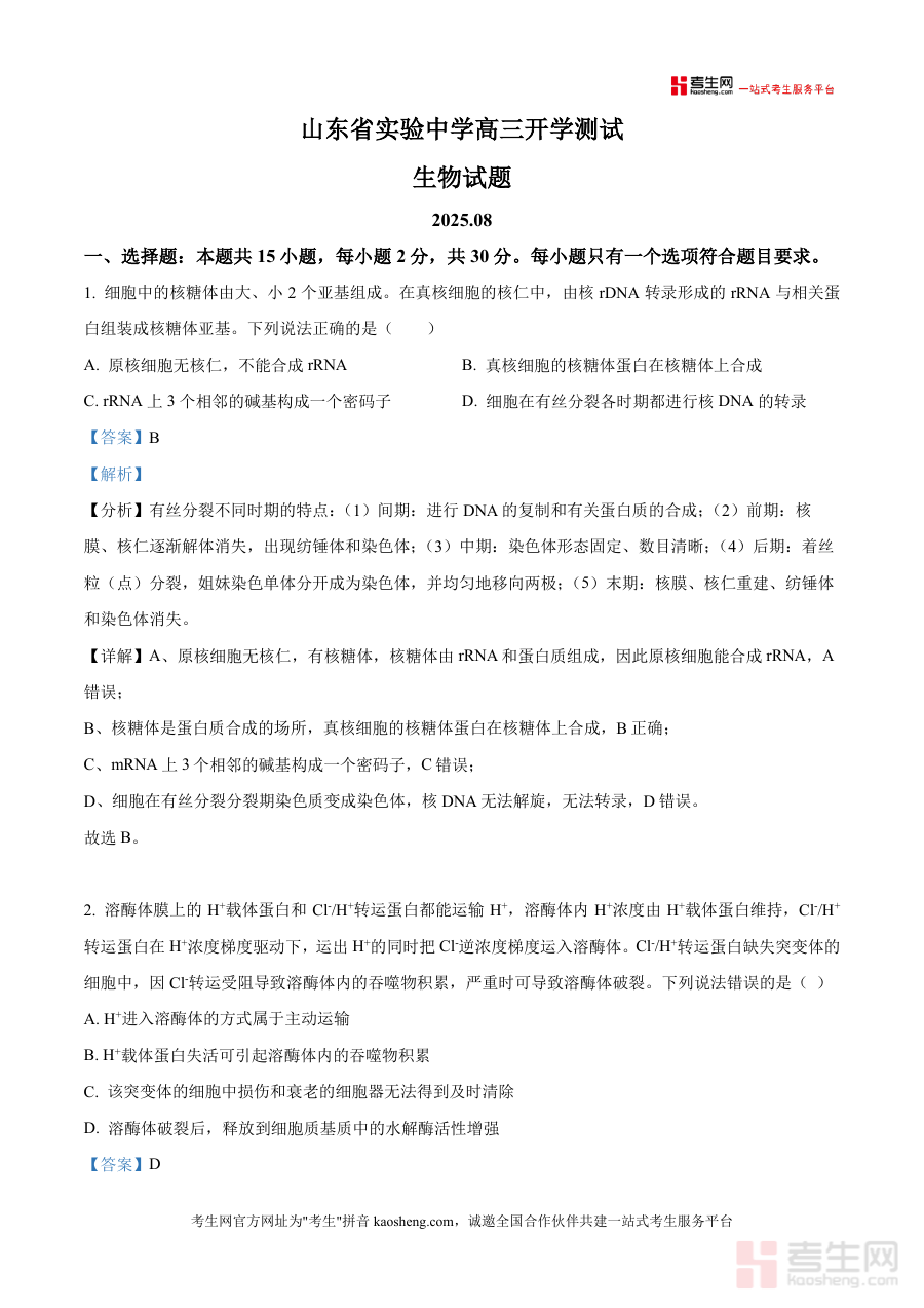 《精品解析:山东省实验中学2026届高三上学期开学测试生物试题(解析版).docx》是一份针对山东省实验中学2026届高三学生在2025年秋季开学阶段进行生物学科测试所配套开发的解析类资料。该资料对应学校高三上学期开学测试这一特定考试场景,整合了此次测试的试题及详细解析内容,为相关使用者提供与此次测试直接关联的数据与参考依据,满足开学初期对测试结果进行深入解读需求,确保资料与考试场景的高度适配性。