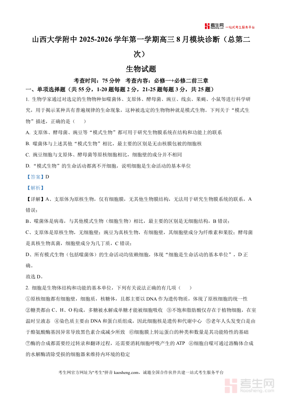 精品解析山西省山西大学附属中学校20252026学。年高三上学期8月模块诊断生物试题解析版docx是一。份针对特定阶段考试的备考资料核心围绕考试的时间地区。与用途展开为考生提供阶段检测与备考参考这份资料的核。心用途在于帮助对应年级的学生明确学习重点通过阶段考。试诊断学情为后续复。