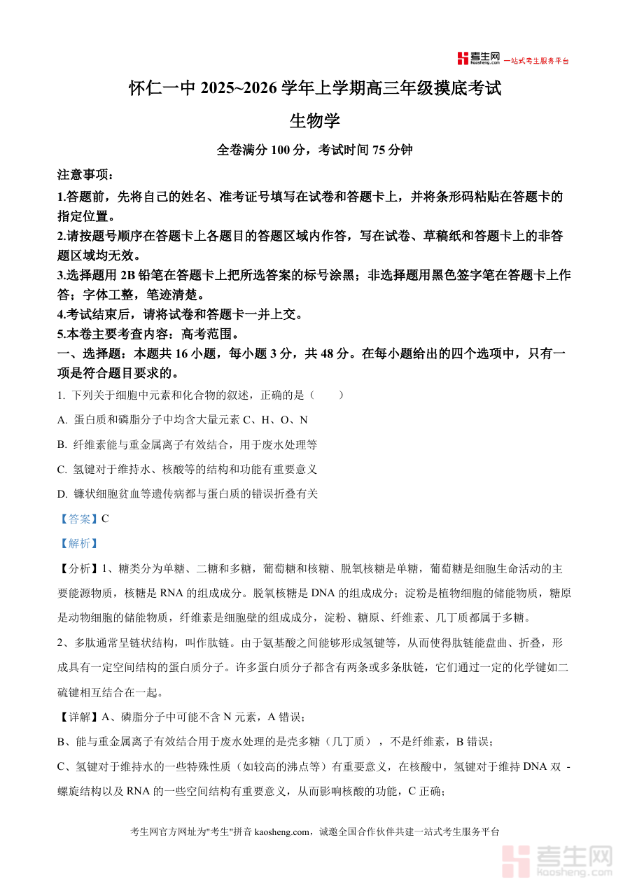 《精品解析:山西省朔州市怀仁市第一中学校2025-2026学年高三上学期摸底考试生物试题(解析版)》是一份针对山西省朔州市怀仁市第一中学校2025-2026学年高三年级上学期摸底考试编制的生物学科试题解析资料,包含该次摸底考试生物科目的完整试题及对应解析内容,考试时间设定为75分钟,全卷满分100分,考查范围覆盖高考要求生物学科知识体系,符合该校高三阶段教学检测与备考衔接需求,为使用者提供该次考试的系统解答参考。