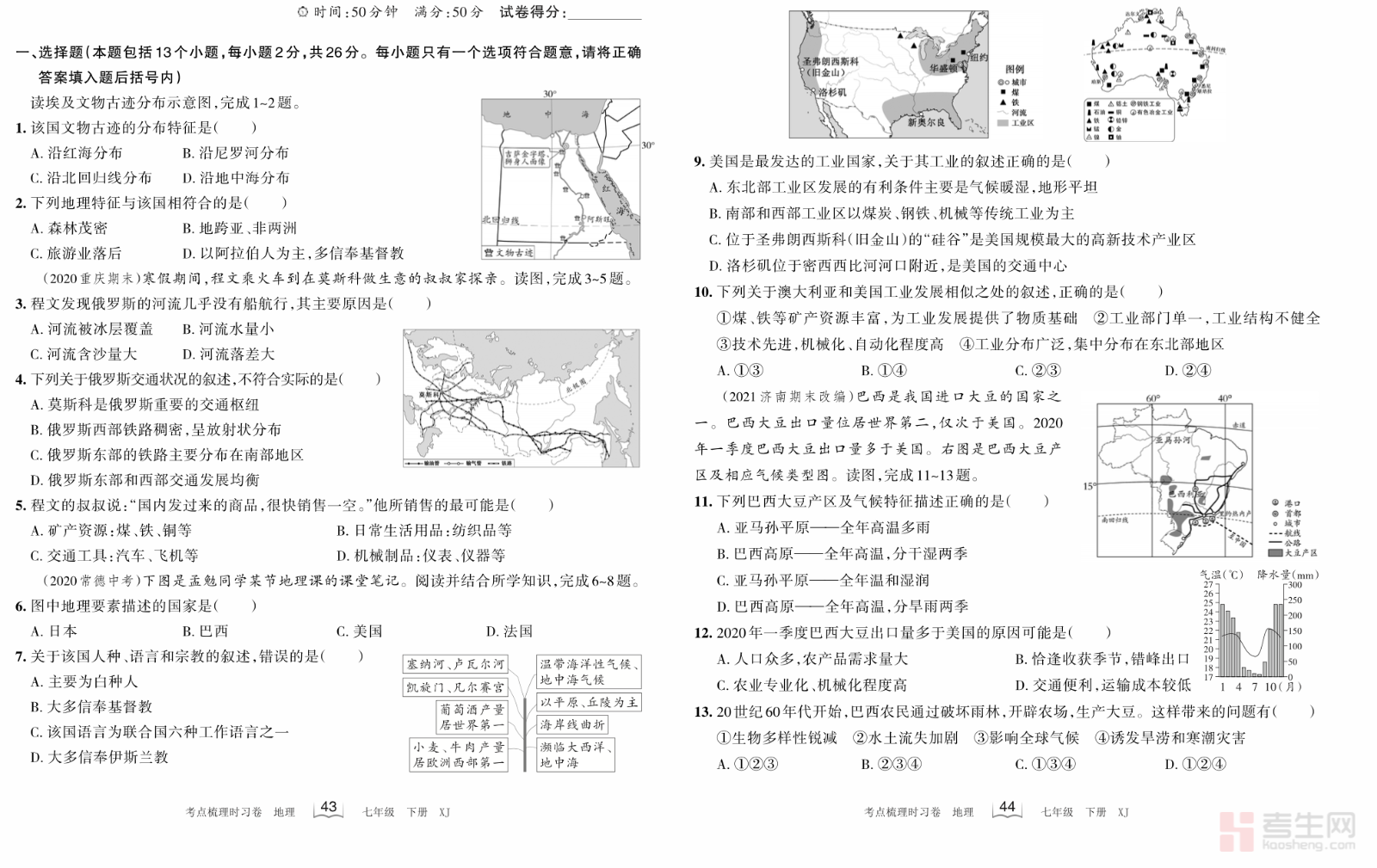 王朝霞初中地理第八章过关检测卷(二)(湘教版)(七年级下册)(含答案解析)紧扣湘教版教材第八章走近国家核心考点,全面覆盖美国、巴西、澳大利亚等重点国家的自然地理、人文经济、资源环境、工业农业等关键知识,题型贴合初中地理考试要求,兼顾基础巩固与能力提升。试卷配备详细答案解析,逐题讲解思路、点明易错点,帮助学生及时查漏补缺、强化知识记忆,适合同步练习、单元检测与考前复习,有效提升地理学习效果与应试水平。请添加微信 18617049513 进专属群,获取更多免费资源!
