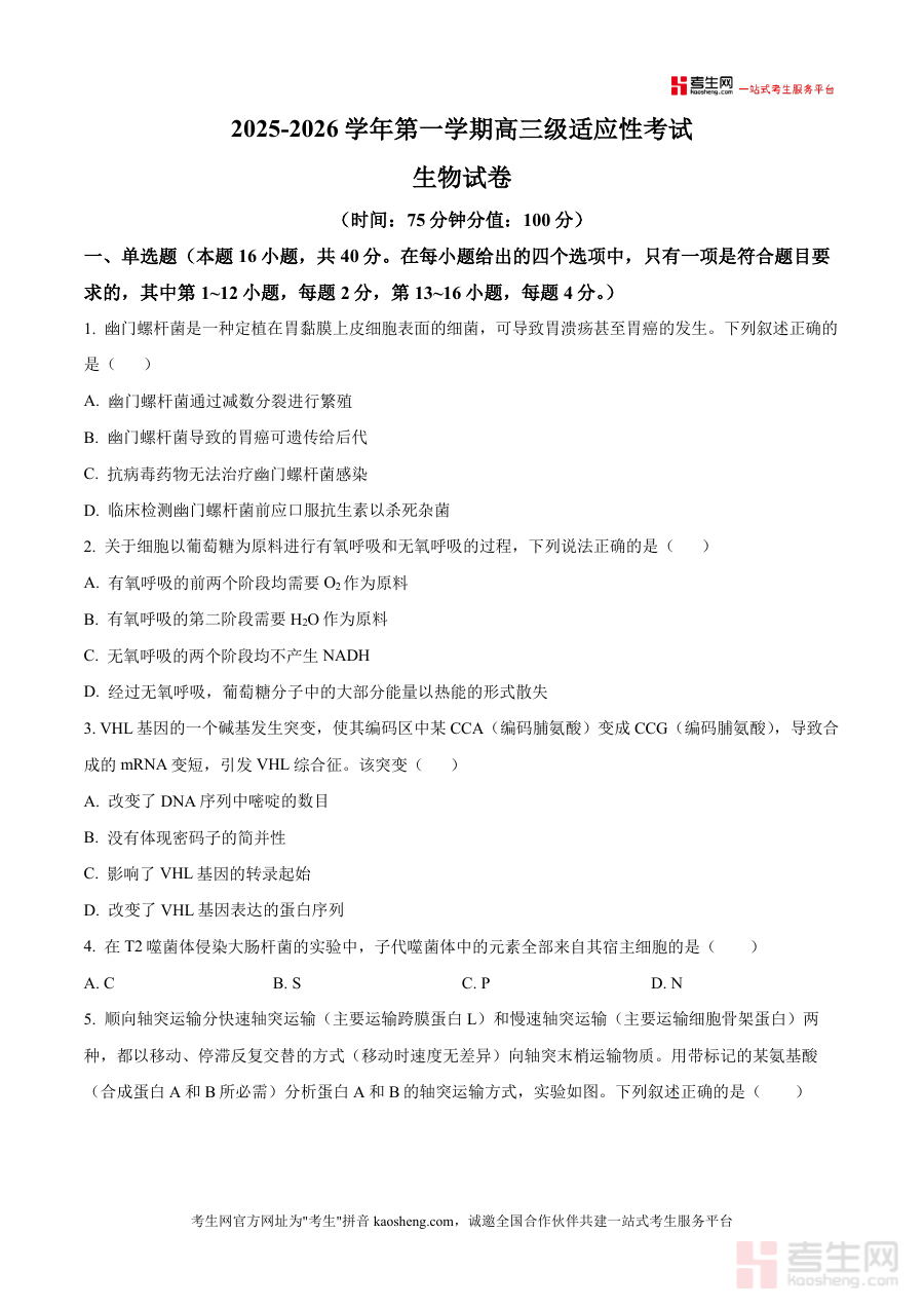 《精品解析:广东省两阳中学2025-2026学年高三上学期开学适应性考试生物试题(原卷版)》是一份对应广东省两阳中学高三年级在2025-2026学年第一学期开学阶段适应性考试的生物学科原卷资料,精准匹配该校高三学生开学初期生物学科检测需求,为相关备考活动提供符合该校考试场景与时间节点的数据载体,确保资料与学校教学进度及开学检测目标保持一致,不涉及具体知识点或题型细节,仅作为该特定考试场景下标准化试题的呈现形式,满足师生对开学适应性检测工具的基础需求。