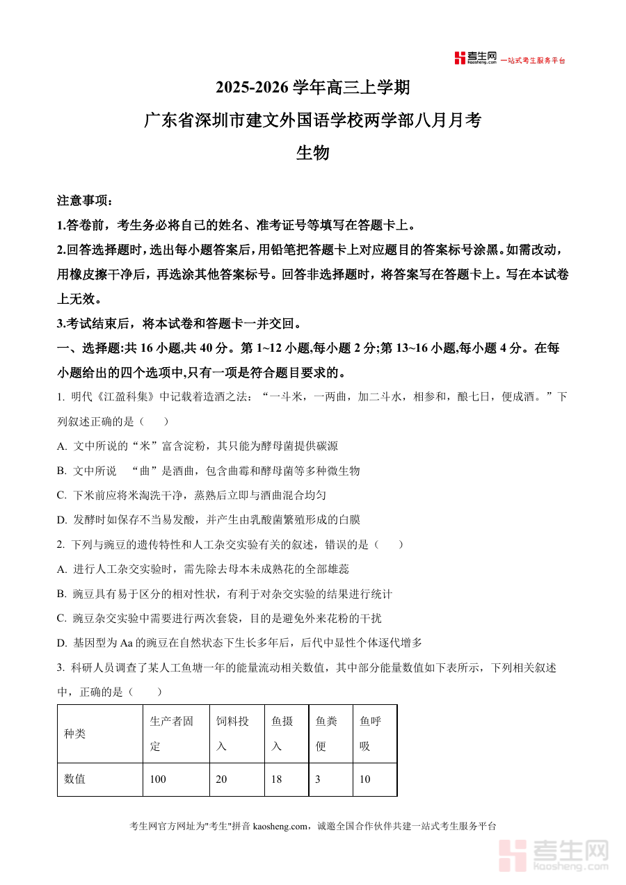 精品解析广东省深圳市建文外国语学校两学部20252。026学年高三上学期8月月考生物试题原卷版docx。是一份针对特定阶段考试的备考资料核心围绕考试的时间。地区与用途展开为考生提供阶段检测与备考参考这份资料。的核心用途在于帮助对应年级的学生明确学习重点通过阶。段考试诊断学情为后。