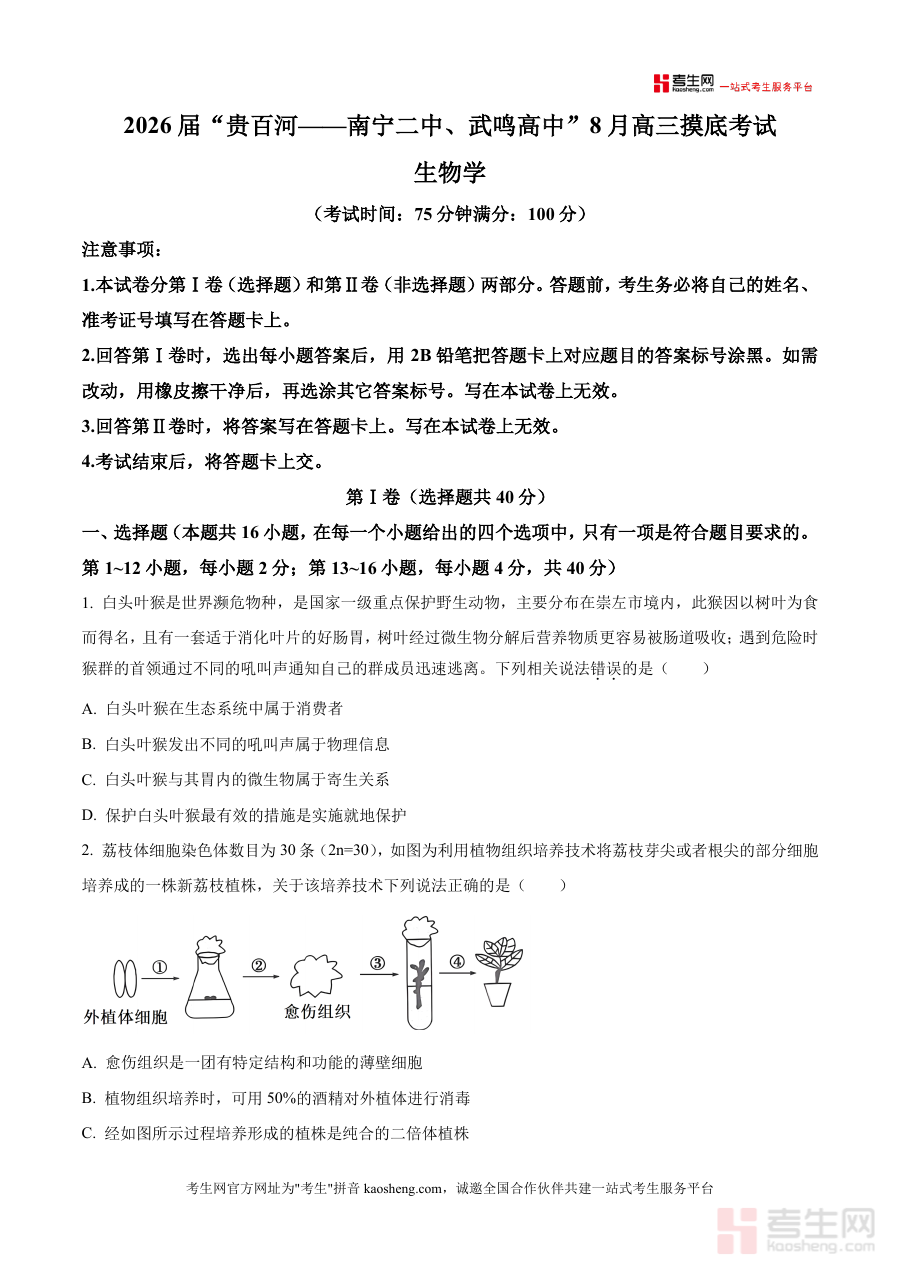 《精品解析:广西壮族自治区南宁市“贵百河”联盟2026届高三上学期8月摸底考试生物试题(原卷版).docx》是一份面向广西壮族自治区南宁市“贵百河”联盟2026届高三学生的生物学科摸底考试原卷资料,对应高三上学期8月开展 的阶段性检测,包含该联盟内南宁二中、武鸣高中等学校参与 的本次生物摸底考试完整试题原貌,为相关备考活动提供贴合考试实际 的基础素材支撑,严格遵循考试时间75分钟、满分100分 的设置要求,呈现了原卷的结构框架与考查形式。