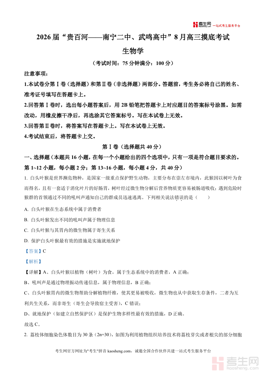 《精品解析:广西壮族自治区南宁市“贵百河”联盟2026届高三上学期8月摸底考试生物试题(解析版).docx》是一份针对2026届南宁市“贵百河”联盟高三上学期8月摸底考试生物科目的专业备考资料。该考试由南宁二中、武鸣高中等联盟学校联合开展,属于高三开学初期阶段性检测,旨在了解学生暑期及前期学习成果,此解析版资料完整配套本次考试试题,提供对应题目的解答分析内容,但未包含超出试题本身知识点拓展或额外训练内容。