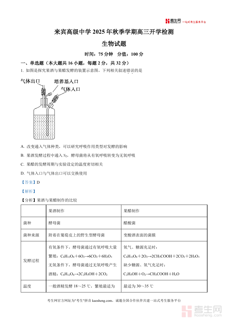 《精品解析:广西壮族自治区来宾市兴宾区来宾高级中学2025-2026学年高三上学期开学生物试题(解析版).docx》是一份针对广西壮族自治区来宾市兴宾区来宾高级中学2025-2026学年高三上学期开学检测的生物学科备考资料。该资料对应学校秋季学期高三开学阶段组织实施生物学科检测需求,为相关教学活动提供配套解析内容支持,是开学检测环节的重要辅助资料之一。