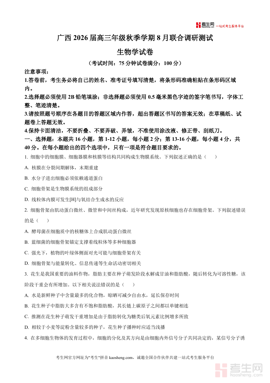 《精品解析:广西壮族自治区邕横教育名校联盟2025-2026学年高三上学期8月联合调研测试生物试题(原卷版)》是一份针对广西壮族自治区邕横教育名校联盟2025-2026学年高三年级秋季学期8月联合调研测试设计制作的生物学科备考资料,该考试由邕横教育名校联盟组织开展,面向联盟内高三学生,属于新学期初期阶段性教学质量检测类考试范畴,旨在通过联合调研形式了解联盟内高三学生生物学科的学习基础情况及阶段性知识掌握程度.