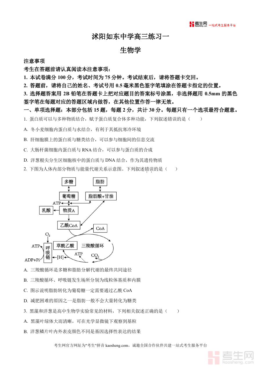 该资料适用于江苏省宿迁市沭阳如东中学2025-2026学年高三学生及生物学科教师,作为高三上学期首次阶段检测的原卷资料,它能够帮助学生了解自身在该阶段生物学科知识掌握情况,也能为教师调整后续教学计划与备考策略提供实际依据,具有明确且针对性强应用价值.