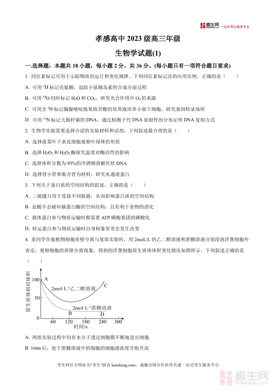 本资料适用于湖北省孝感高级中学高三年级学生及相关备考辅导人员使用。对学生而言不仅是阶段性检测工具,更是了解自身学习状况、制定个性化复习计划的重要参考;对教师及辅导人员来说,能帮助掌握学生学习动态优化教学方案提高备考指导效率。作为学校内部测试原卷,具有较高针对性与适用性,真实反映该校高三生物教学进度及考查重点,对学生适应高三学习节奏提升生物学科成绩有积极辅助作用。