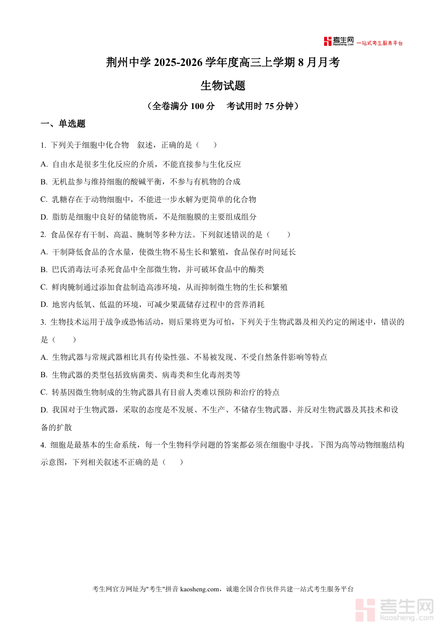 该资料适用人群主要包括湖北省荆州中学XXXX年高三年级学生群体、该校高三生物学科教师人员以及需要参考同类阶段性测试原卷 的其他学校师生或备考指导人员,能够帮助他们获取真实考试资料,了解该阶段生物学科测试实际情况,为教学实践或备考准备提供有效资源支持,助力提升阶段性学习与教学质量。