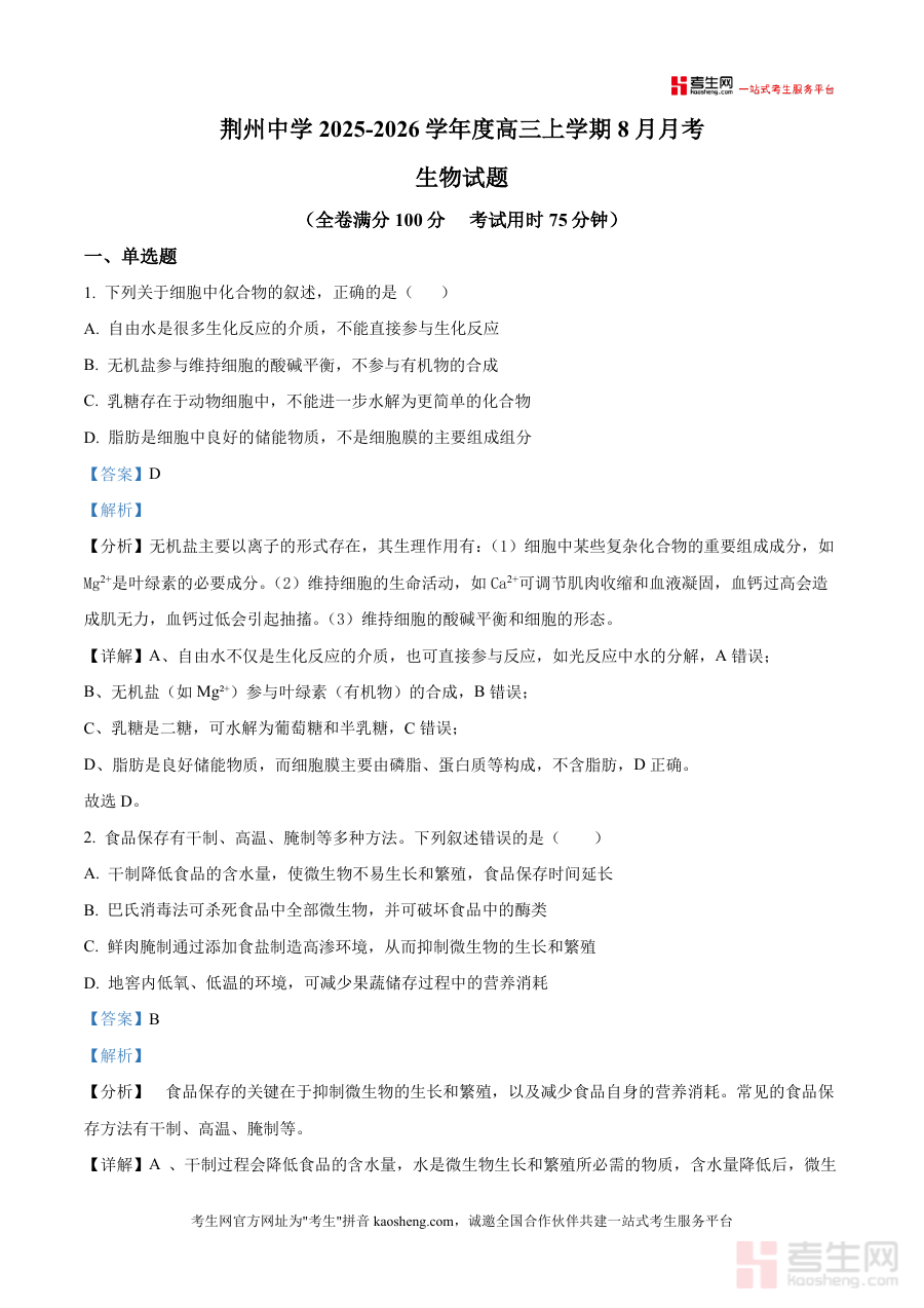 《精品解析:湖北省荆州中学20XX-XXXX学年高三上学期8月月考生物试卷(解析版).docx》是一份针对湖北省荆州中学在20XX至XXXX学年组织实施的高三上学期8月生物学月考考试编制而成 的配套备考资料。它包含该次月考的完整试题内容及每道题目的详细解析部分,严格对应该校该阶段生物学教学进度与检测标准,旨在为使用者提供与本次月考完全匹配的学习反馈支持,助力完成月考后的知识巩固环节。