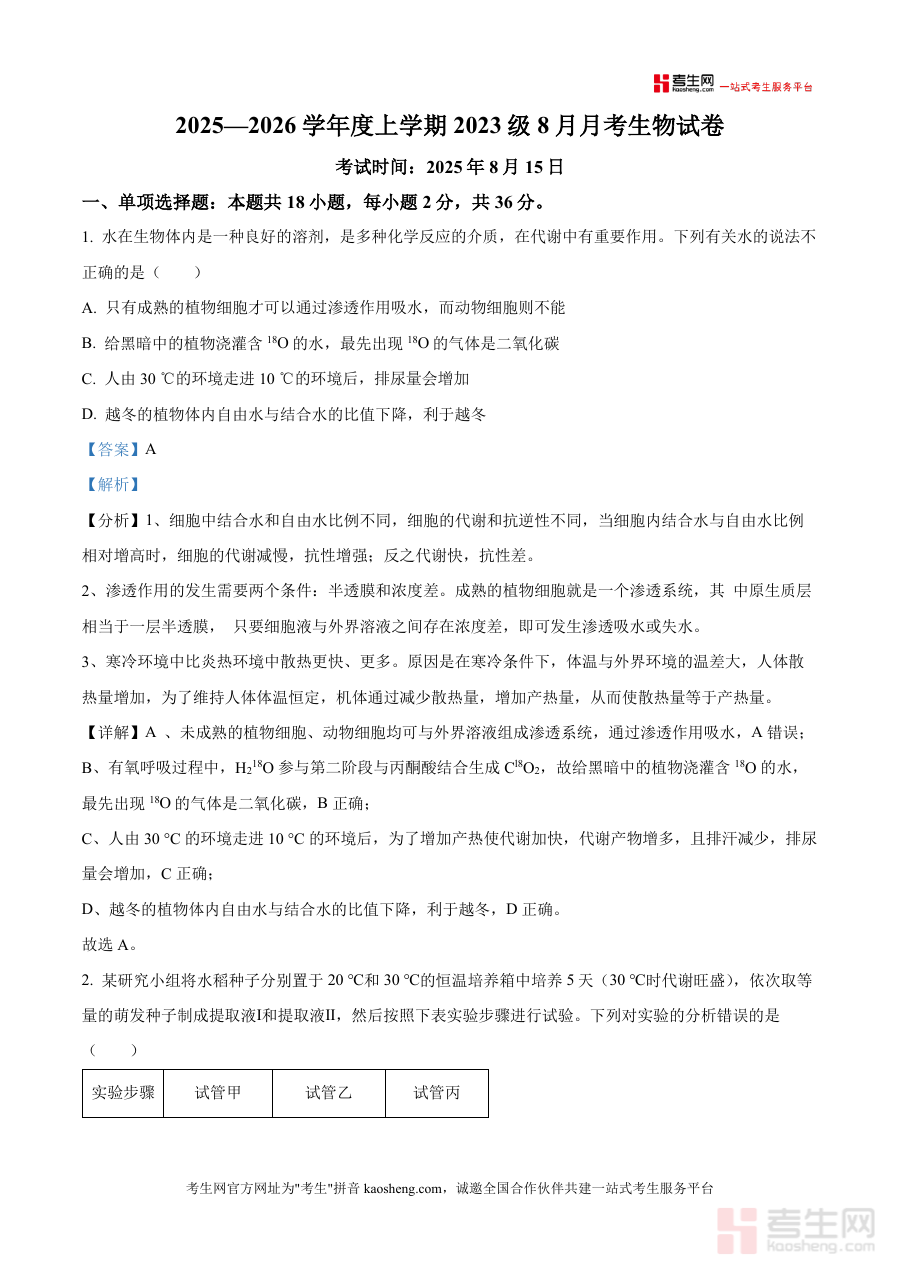 《精品解析:湖北省荆州市沙市区湖北省沙市中学2025-2026学年高三上学期8月月考生物试题(解析版)》是一份针对湖北省荆州市沙市区湖北省沙市中学2025-2026学年高三上学期8月生物月考的解析类备考资料,对应高三学生新学期初期阶段的生物学科月度检测,包含本次考试试题完整解析内容,未涉及具体知识点拓展或额外题型补充,严格基于本次考试元信息编制。