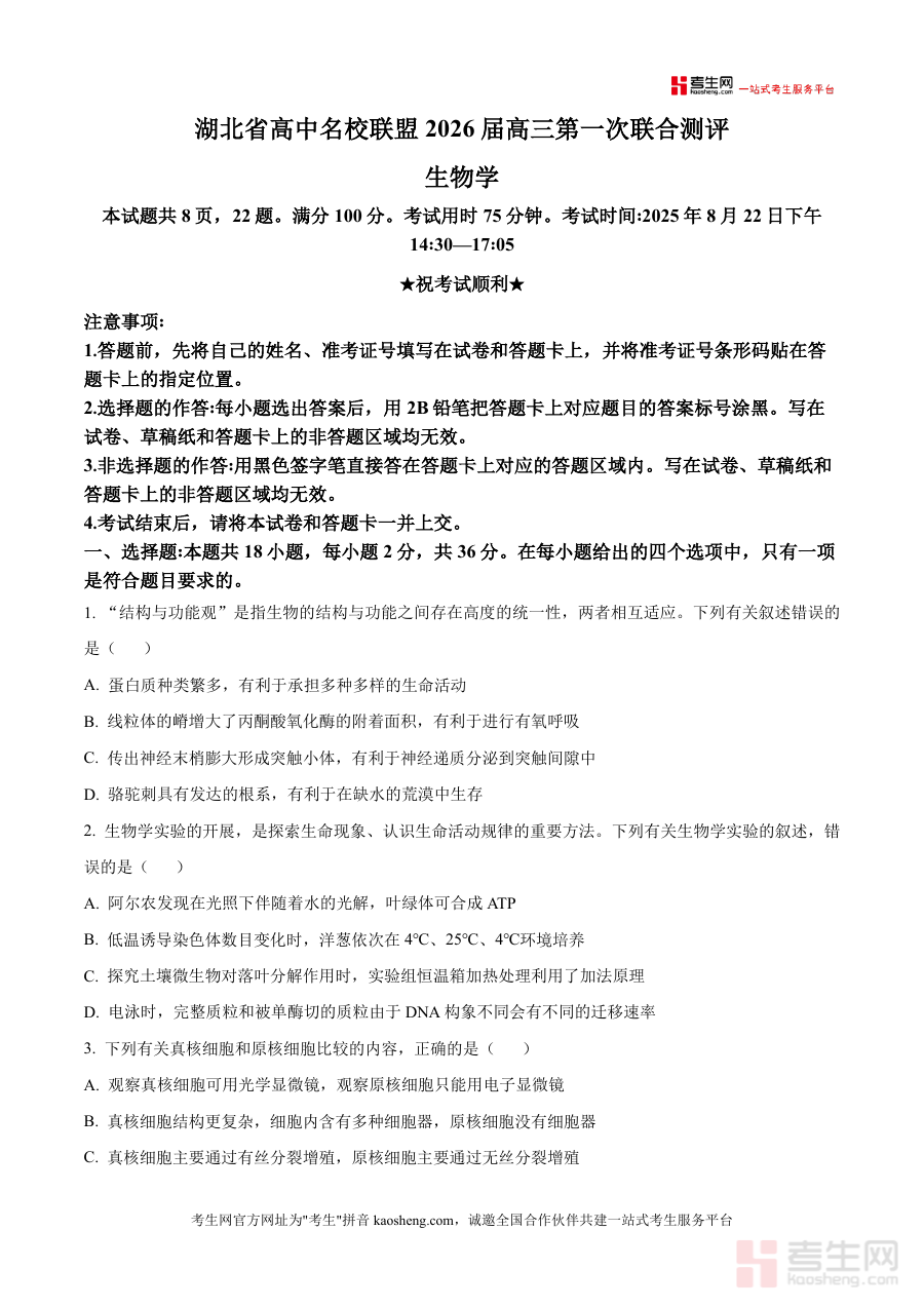《精品解析:湖北省高中名校联盟2025-2026学年高三上学期8月第一次联合测评生物试卷(原卷版)》是一份针对湖北省高中名校联盟2026届高三学生在2025年8月开展第一次联合测评设计的生物学科原卷版资料;该考试属于高三上学期开学初期阶段性检测,元信息显示试卷共8页、22题,满分100分,考试用时75分钟,考试时间为2025年8月22日下午特定时段;作为原卷版资料能完整呈现本次测评生物试卷结构与考试要求及答题规范等基础信息;为相关备考提供符合考试实际形式与规范要求的数据支撑依据;确保使用者可准确获取本次测评核心形式参数。