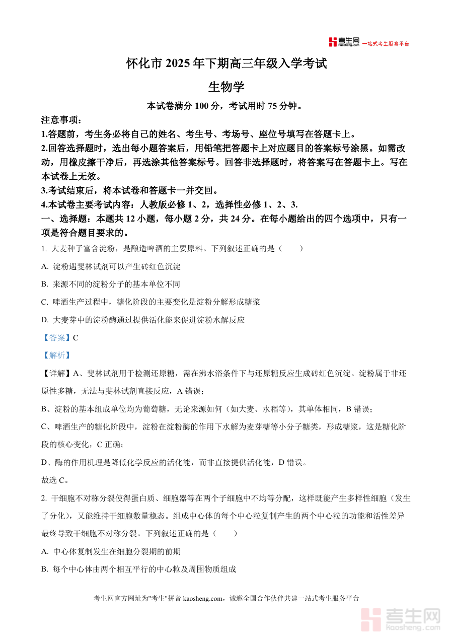 此资料主要适用于湖南省怀化市范围内高三年级学生及生物学科教师,以及从事高三生物备考辅导工作相关人员使用,作为高三开学阶段生物学科检测考试重要参考资料,帮助使用者准确把握本地入学考试生物学科特点,助力阶段学习成果评估与后续高三生物学科学习计划及备考策略制定,具有较强针对性与实用价值,是本地高三生物入学考备考的重要辅助资源。