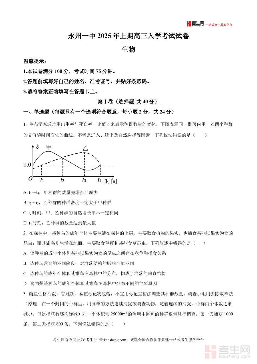 精品解析湖南省永州市零陵区永州市第一中学20252。026学年高三上学期开学生物试题原卷版docx是一。份针对特定阶段考试的备考资料核心围绕考试的时间地区。与用途展开为考生提供阶段检测与备考参考这份资料的核。心用途在于帮助对应年级的学生明确学习重点通过阶段考。试诊断学情为后续复。