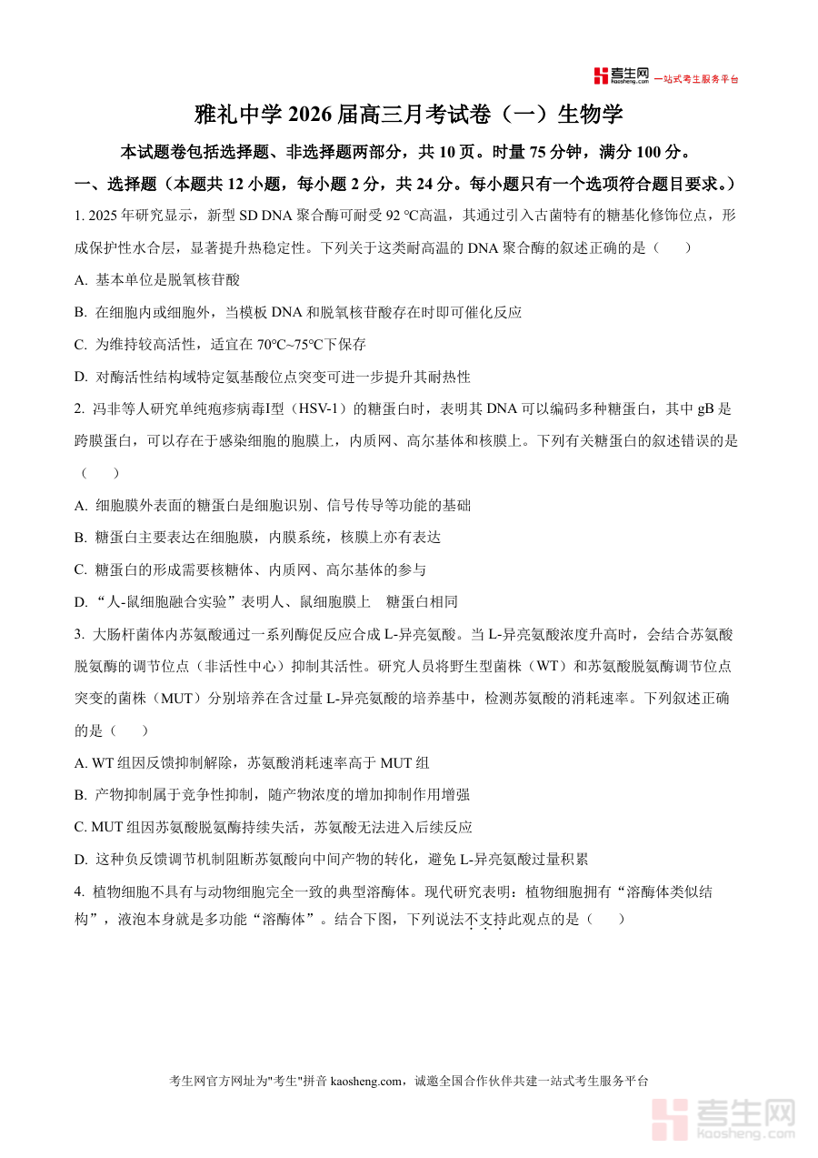该资料适用于湖南省长沙市雅礼中学2026届高三在读学生及该校生物学科教师,也可作为关注该校备考动态相关辅导人员参考资料;作为高三上学期首次月考原卷,它能够让使用者精准把握该校该阶段生物学科考查框架与要求,助力阶段性学习效果验证与备考方向明确,具有较强实用性与针对性。