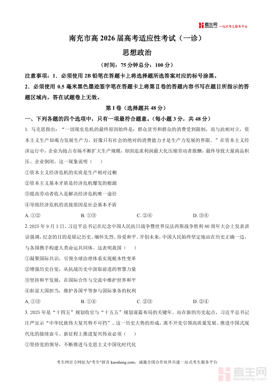 该资料适用于2026届四川省南充市高三学生及政治学科教师,作为高三上学期高考适应性考试(一诊)前的备考准备资料具有阶段性检测参考价值,有助于师生把握当地高考适应性考试的基本框架与流程,为下一阶段针对性备考规划提供必要的支撑,辅助师生做好该次阶段性检测前的准备工作。