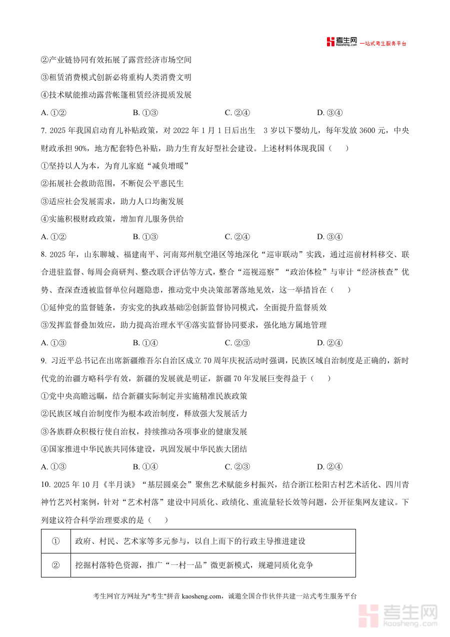 《精品解析:2026届四川省南充市高三上学期高考适应性考试(一诊)政治试题(原卷版).docx》是一份针对2026届四川省南充市高三学生设计的高考适应性考试(一诊)政治学科原卷资料。该资料对应高三上学期阶段的高考适应性检测环节,是当地高考备考进程中重要的阶段性考试资料,能够体现该地区高三政治学科备考方向与阶段性检测的基本要求,为师生提供该考试环节的原卷参考。
