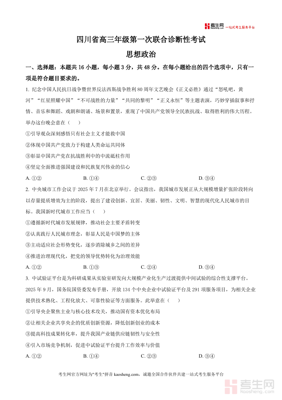 《精品解析:2026届四川省成都市蓉城名校联盟高三上学期第一次联合诊断性考试政治试题(原卷版)》是一份针对2026届四川省成都市蓉城名校联盟高三上学期第一次联合诊断性考试设计制作的政治学科原卷备考资料。该资料紧密对应蓉城名校联盟组织的区域性高三上学期首次联合诊断考试场景,能够完整呈现本次诊断考试政治科目的原卷结构、题型分布及题目呈现形式,为相关使用者提供与该次考试直接关联的原卷参考资源,助力其精准对接本次诊断考试要求,把握试卷基本框架与考查载体。